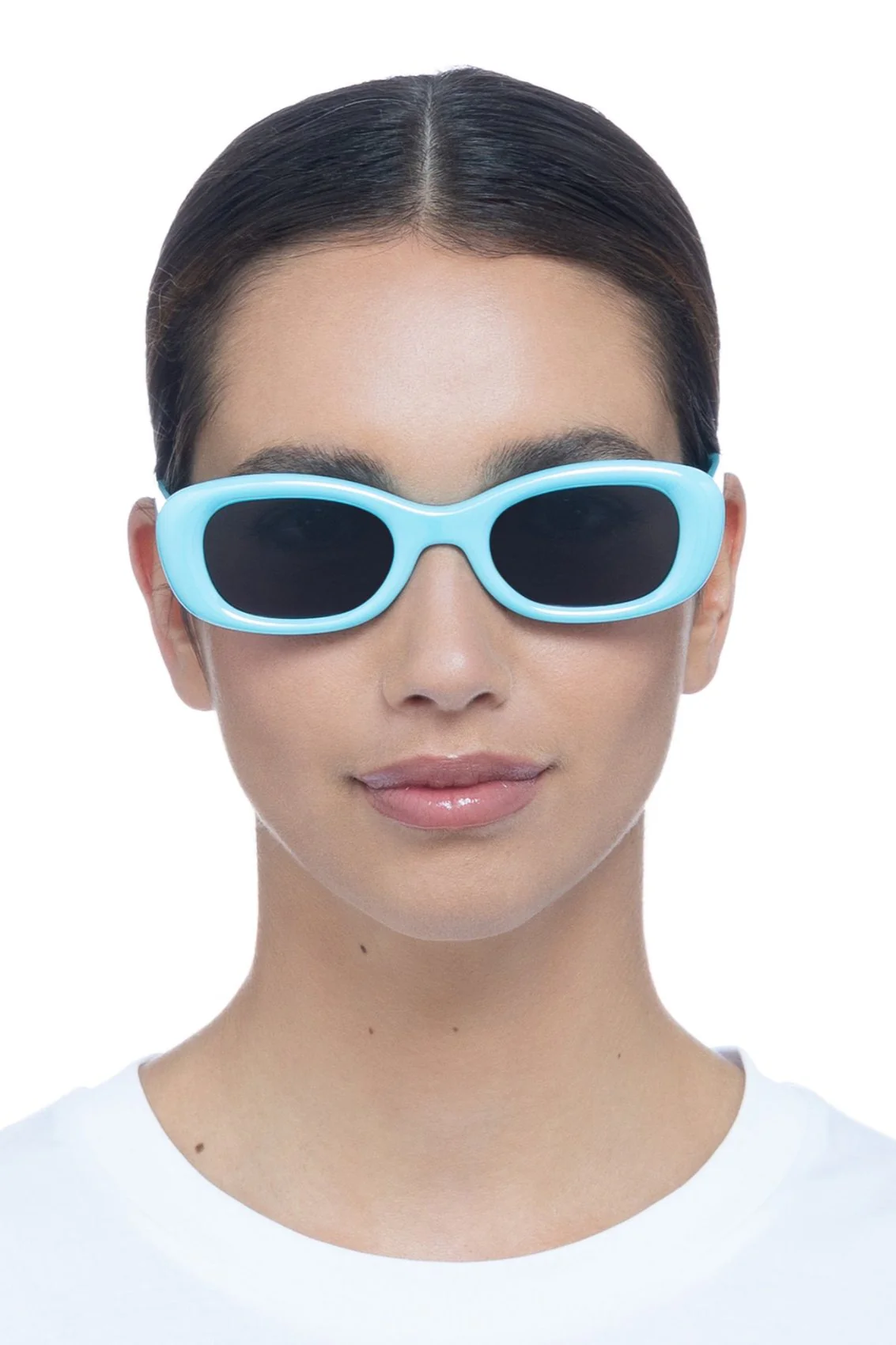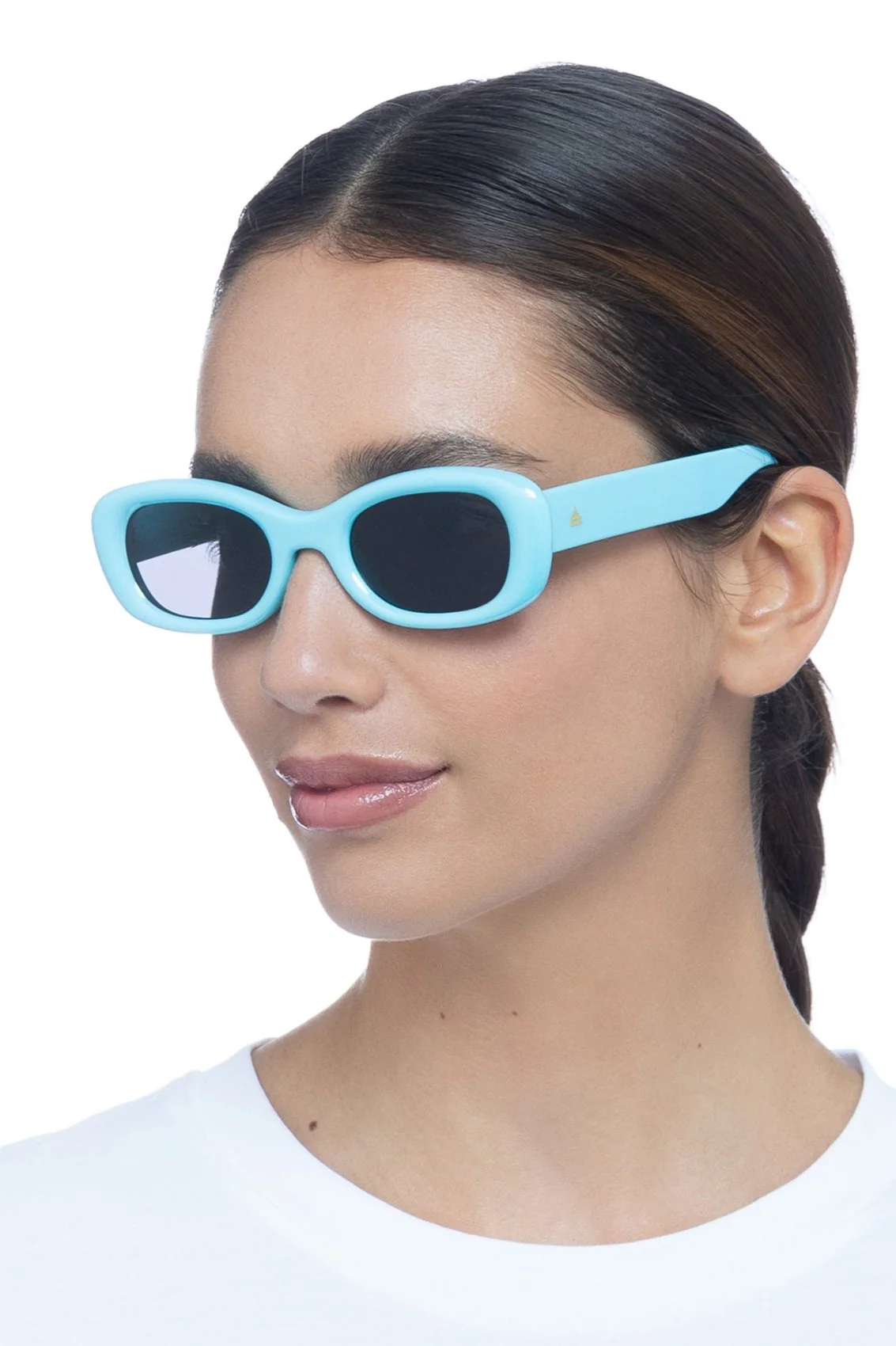 • Une forme ovale classique des années 90 • Un look incontournable • Ambiance estivale avec une monture bleu glacier irisée et des verres mono fumés