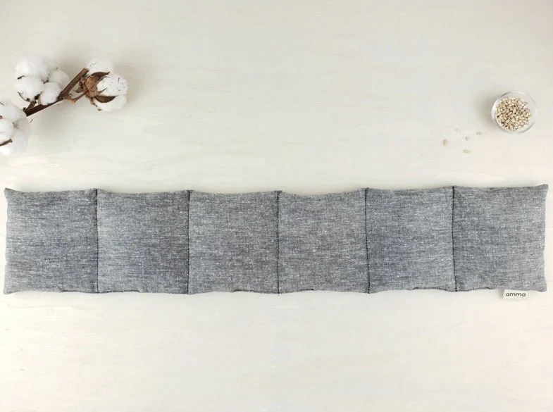 Long coussin enveloppant polyvalent. Avec ses 6 sections qui gardent les grains en place, le coussin peut enrober toutes les parties du corps pour soulager les raideurs musculaires, les maux de ventres, les blessures, les migraines, l’arthrite, etc.