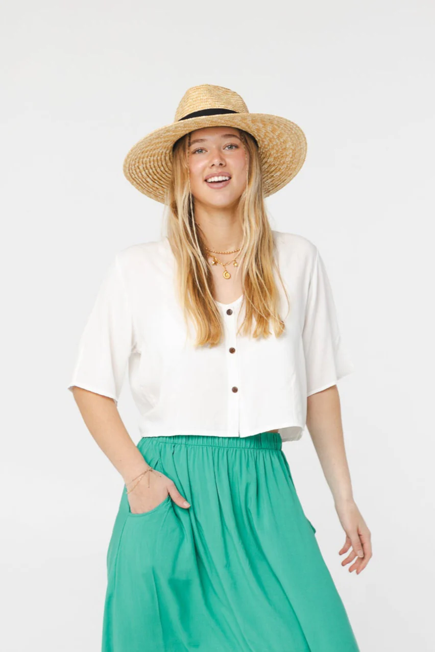 Blouse blanche à manches courtes, coupe ample, boutonnée à l’avant.