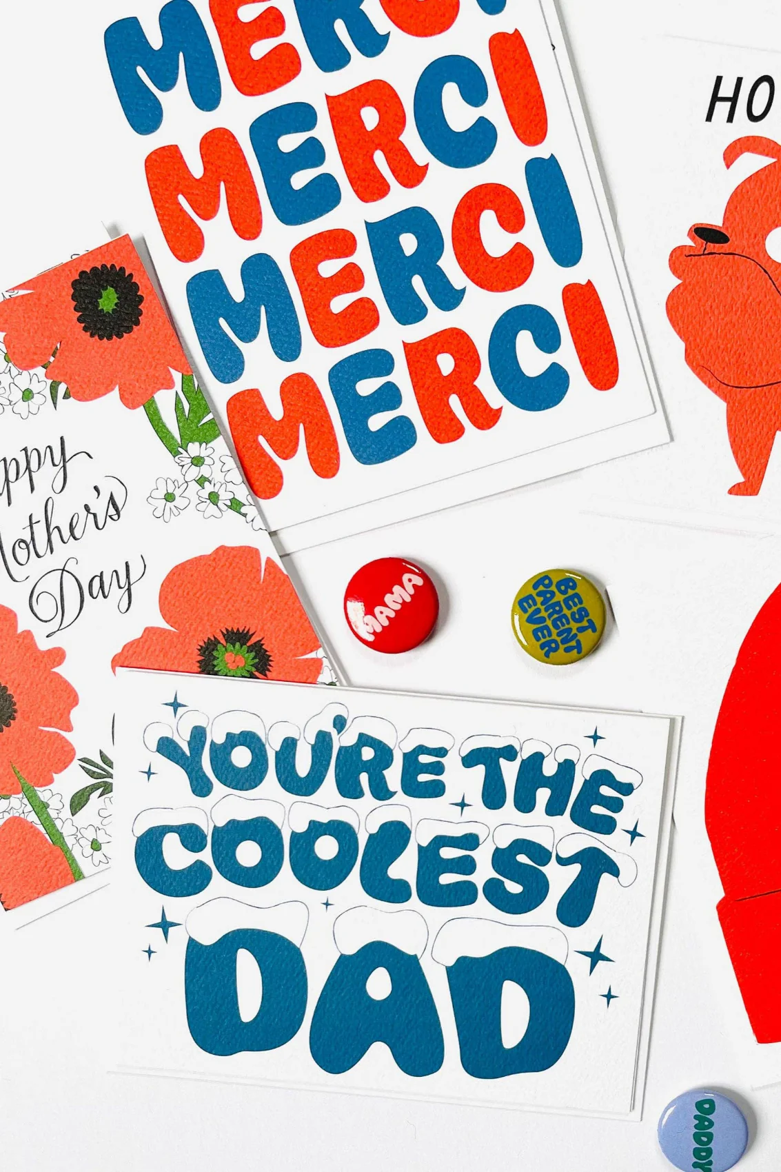 Création locale faite avec amour et talent à Canada Dites merci à la française ! Merci Merci Merci dans une typo dessiné à la main et avec un graphisme rouge et bleu. Imprimé en offset sur du papier recyclé au Canada. La carte vierge mesure 4,25 x 5,5 pouces et comprend une enveloppe A2.