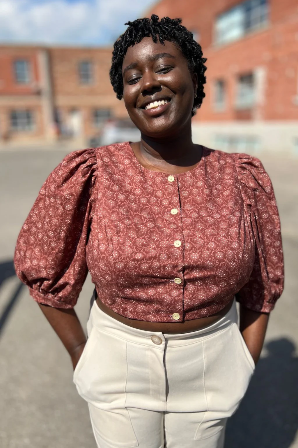 Création locale, faite avec amour et talent au Canada Robin est un haut boutonné à encolure dégagée, avec des coutures princesse et des manches longues resserrées par un revers. Ce magnifique imprimé Parlour 100 % coton est doublé d’un voile 100 % coton certifié OEKO-Tex. Parlour a un fond rouge brique profond avec des branches […]