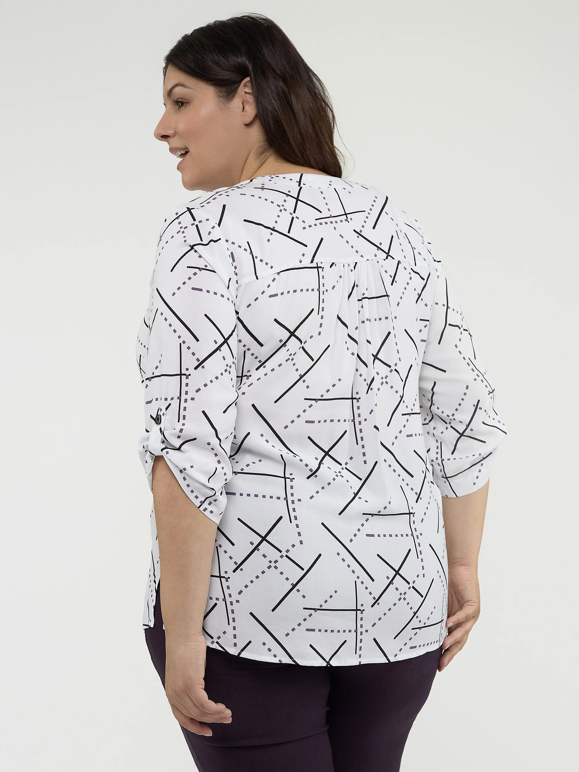 Ce chemisier chic au motif accrocheur est parfait pour dynamiser votre garde-robe. Son style polyvalent passera facilement du bureau aux cocktails après le travail.
