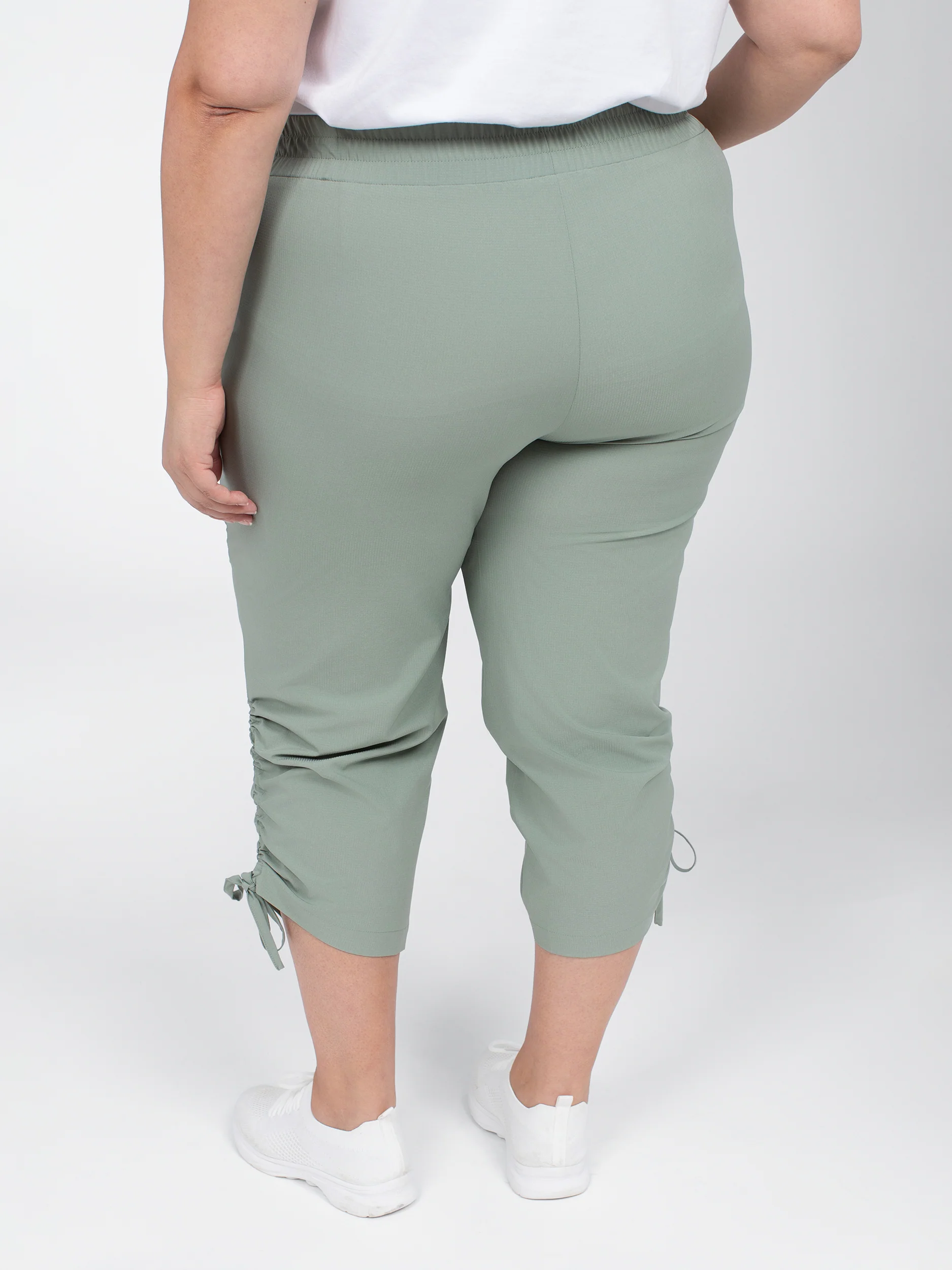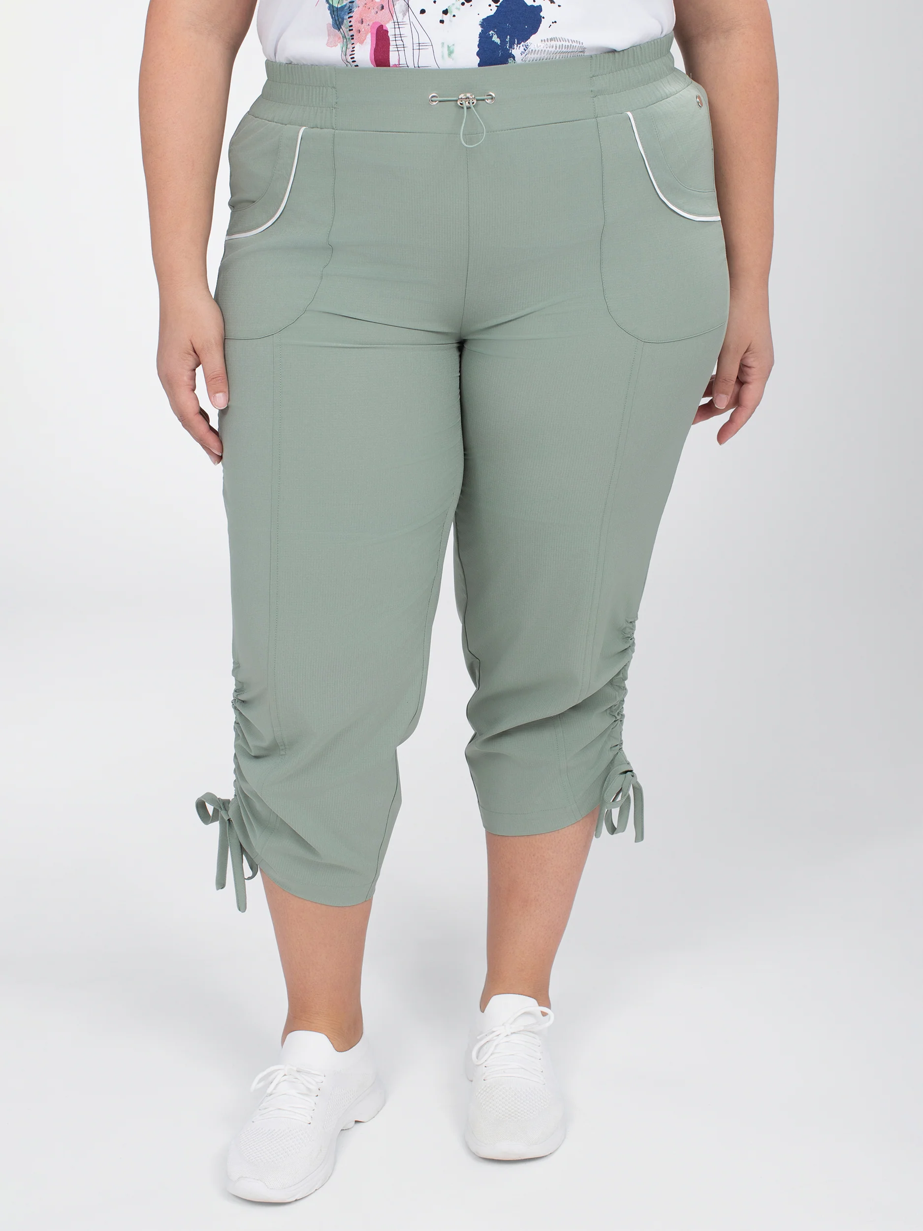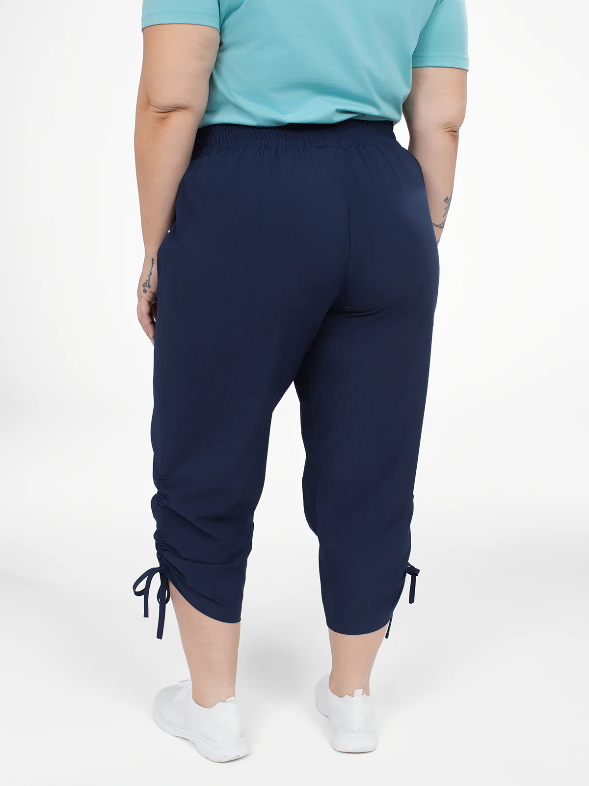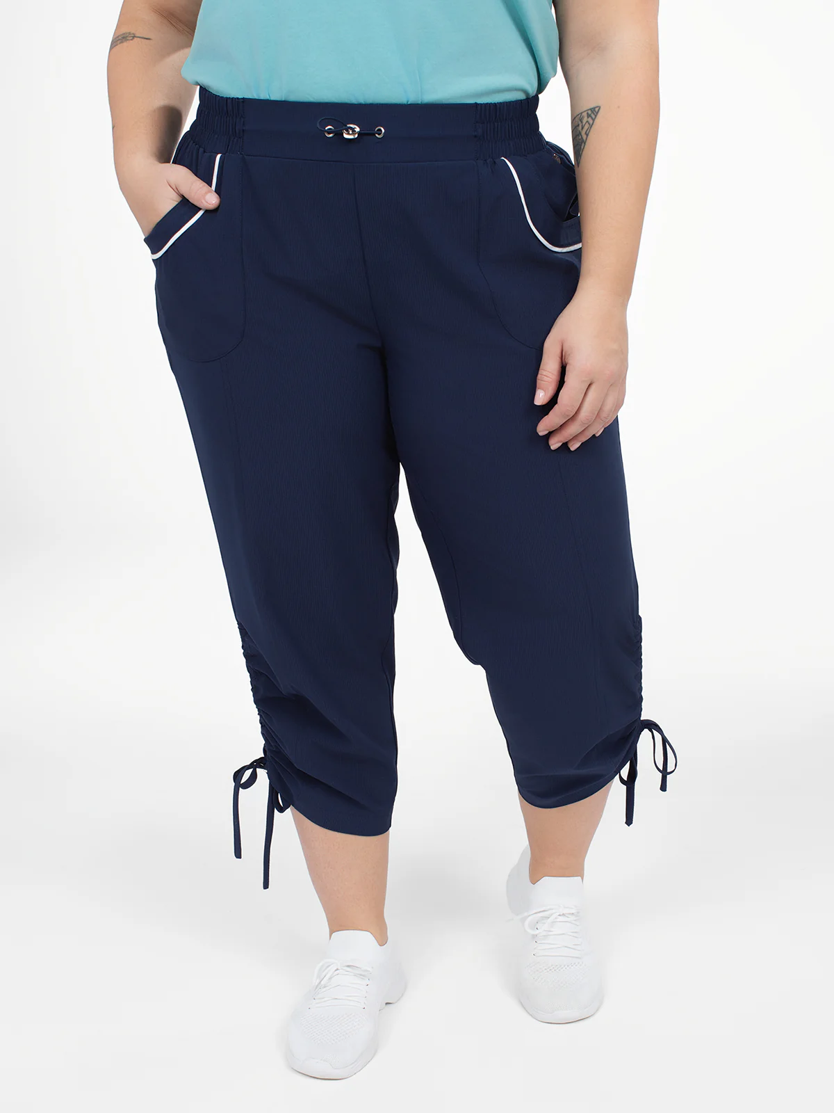 Ces pantalons capri taille plus offrent un confort optimal grâce à leur taille élastiquée et leur matière légère. Les détails froncés et ajustables au bas apportent une touche personnalisée à votre tenue, idéale pour les journées actives.