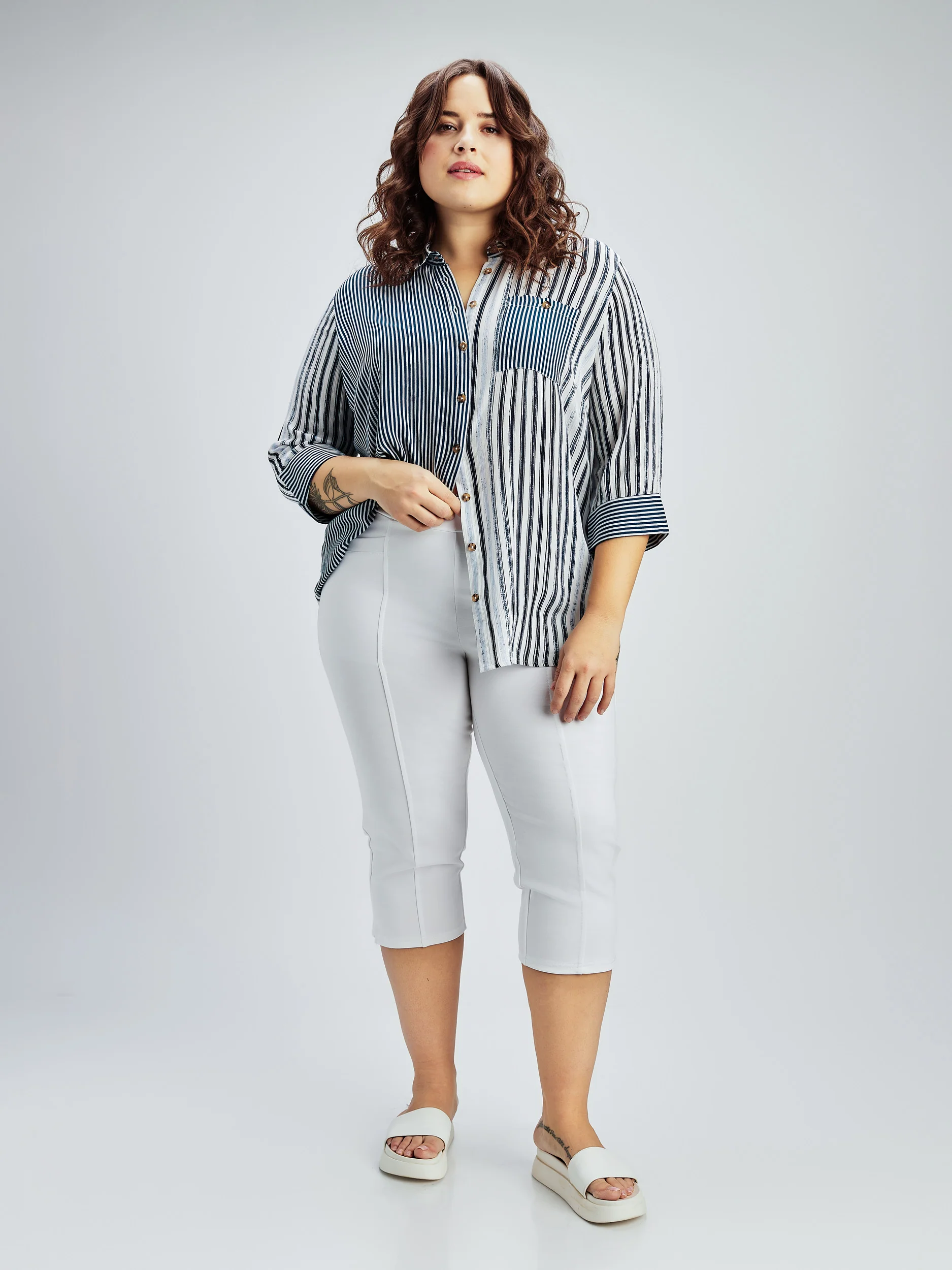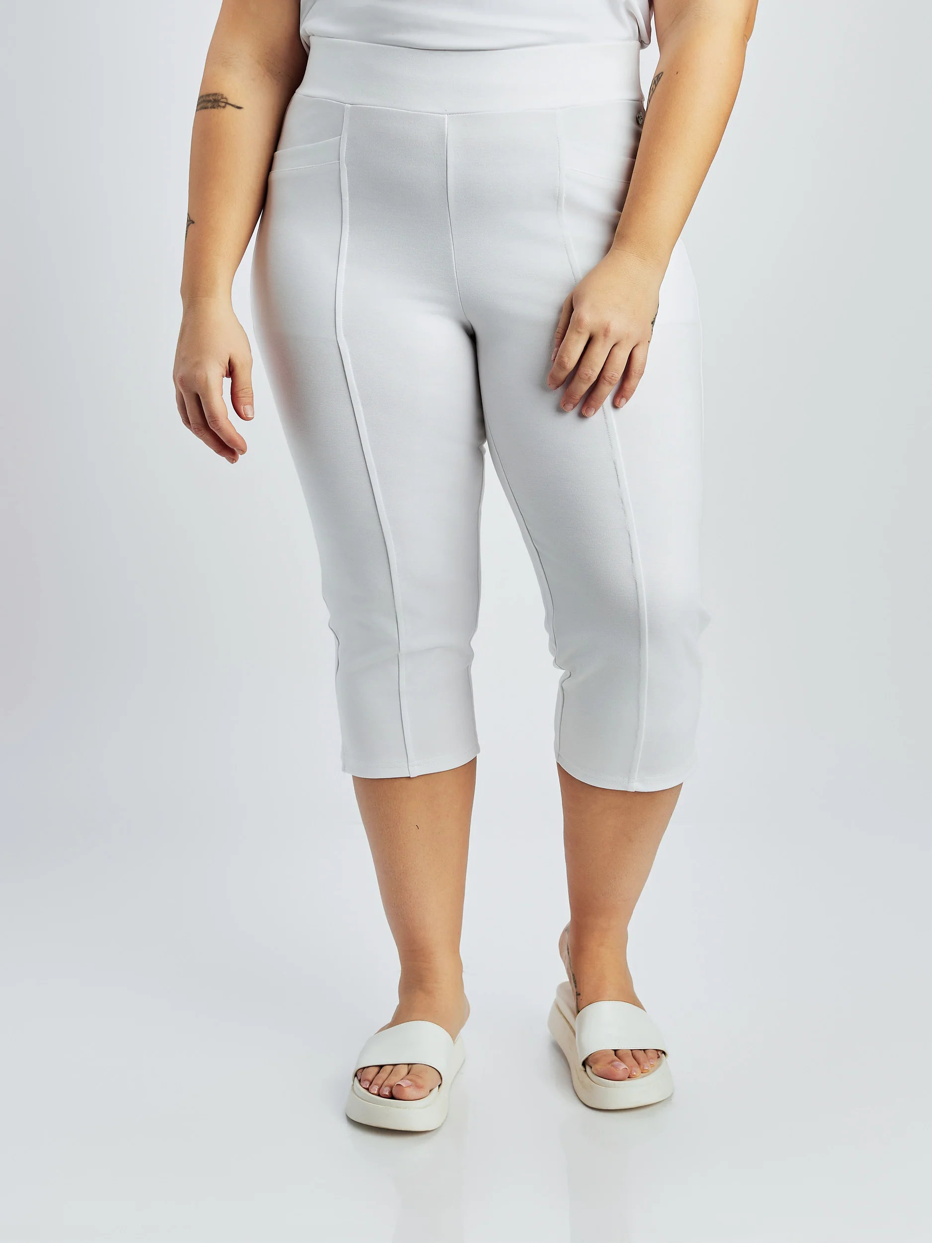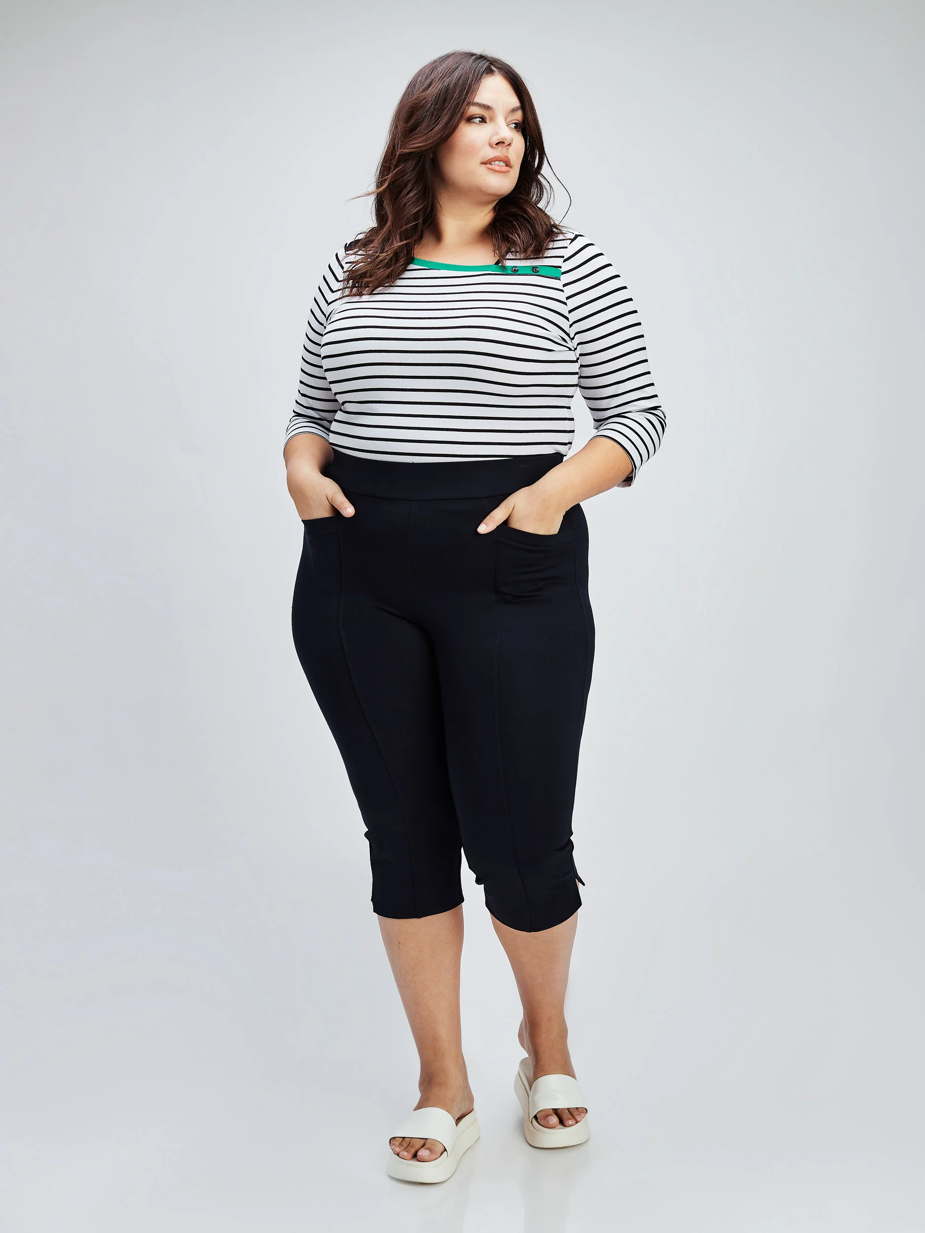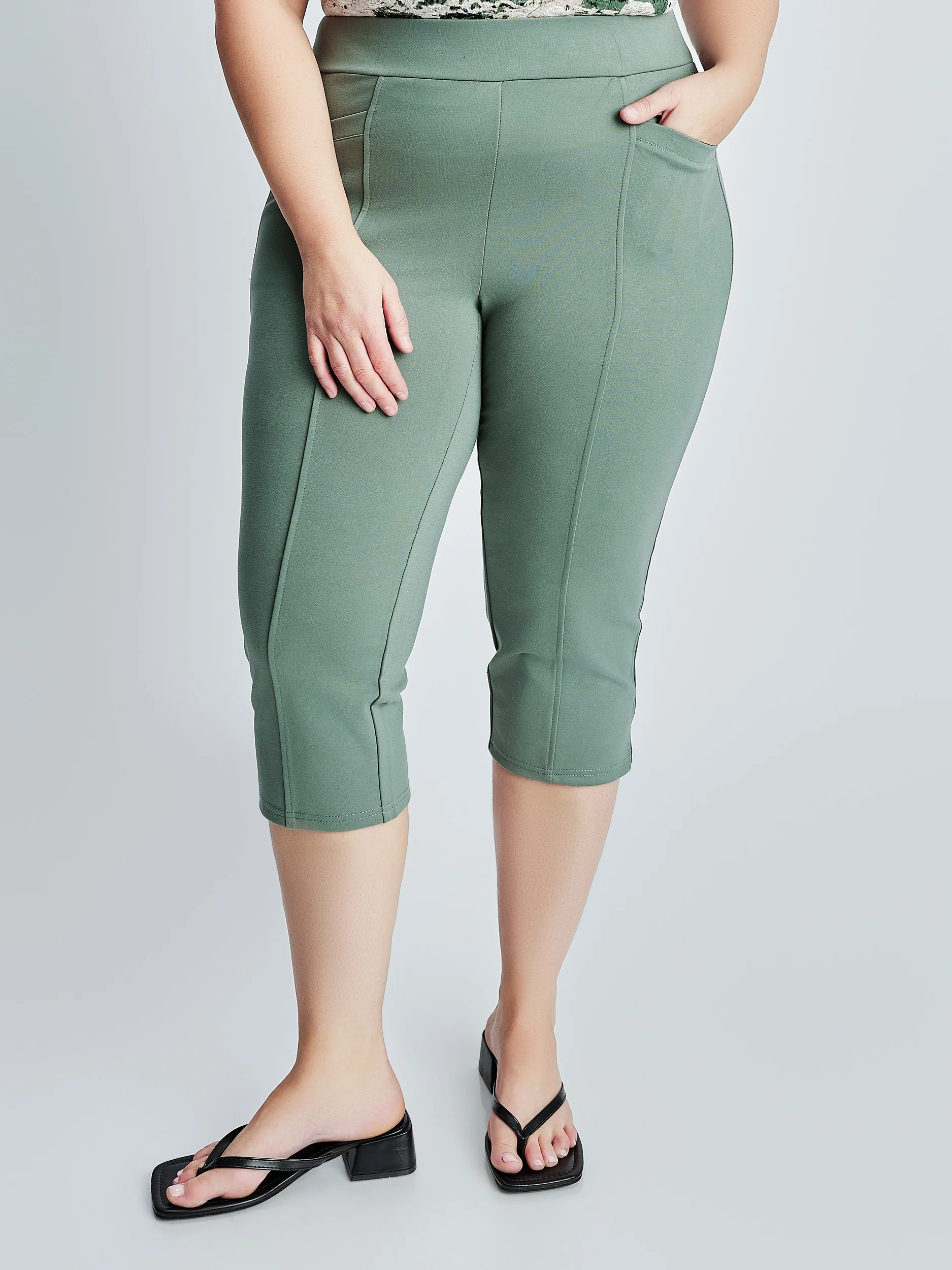 Pantalon capri coupe ajusté, doté de deux poches sur le devant et de surpiqûres le long de la jambe, ainsi qu’une petite fente à l’ourlet.