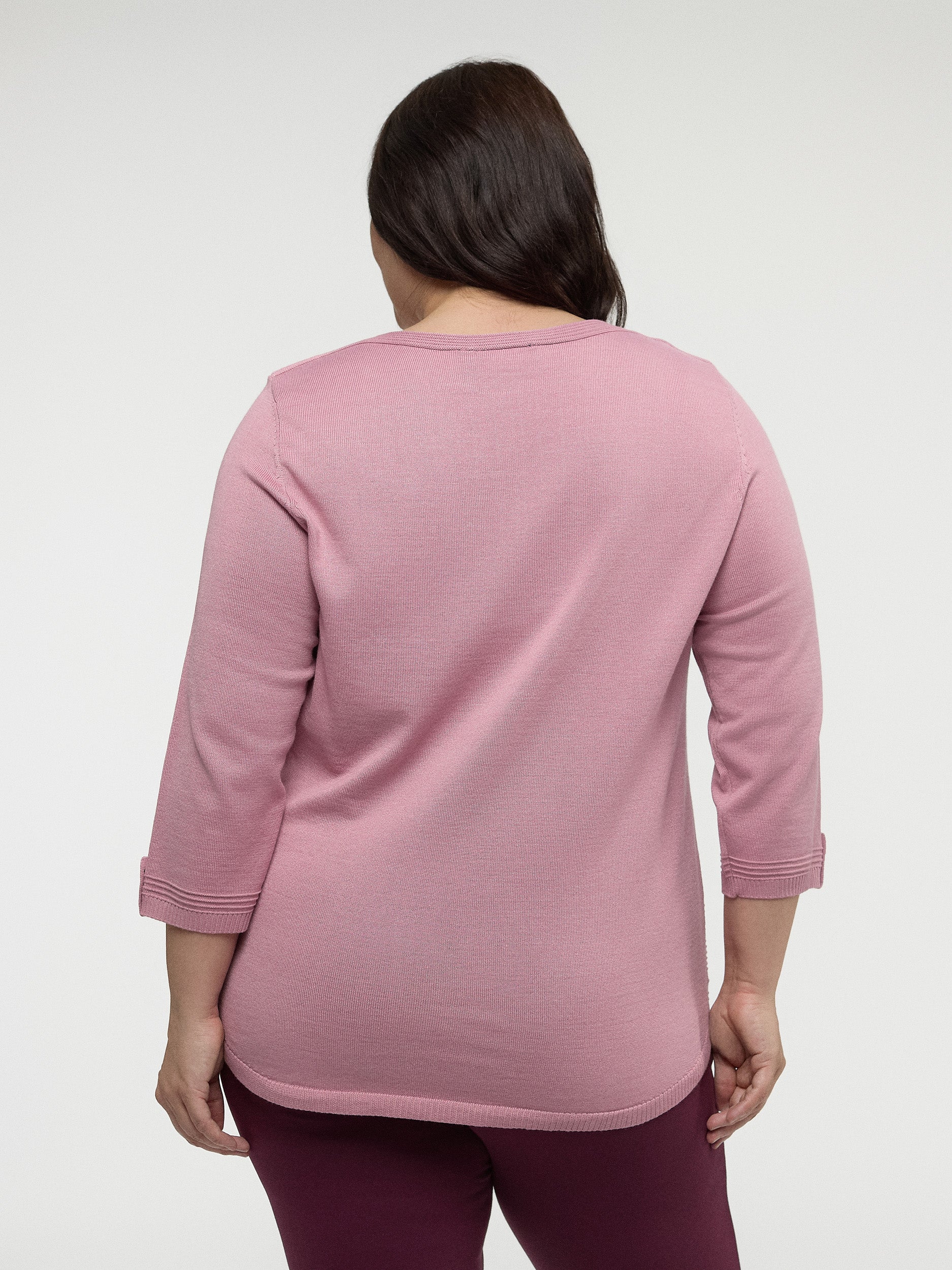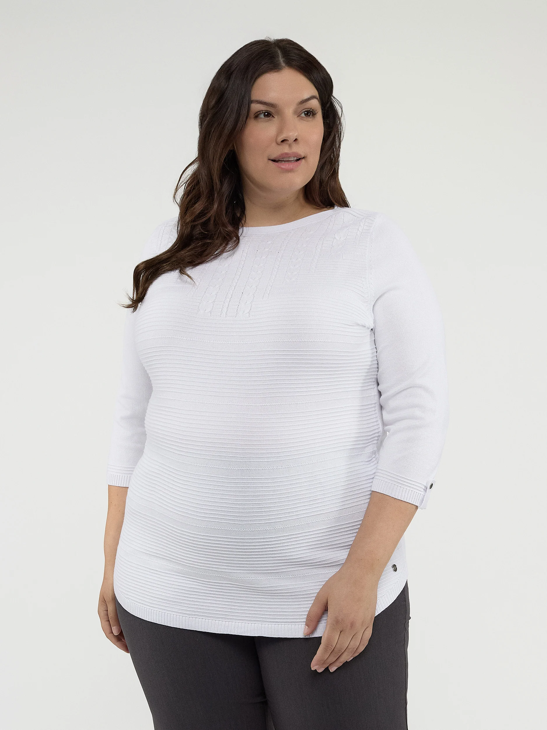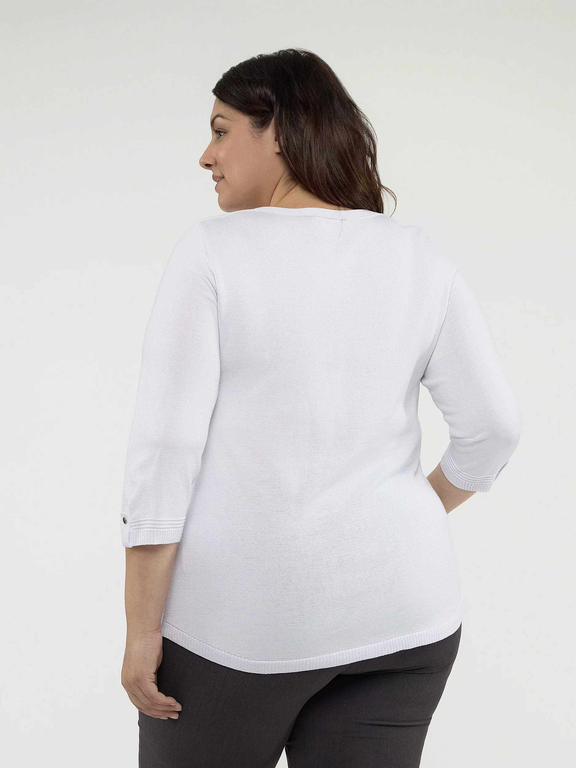 Ce chandail classique et équilibré s’associe parfaitement à un jean ou à une jupe pour un look intemporel.