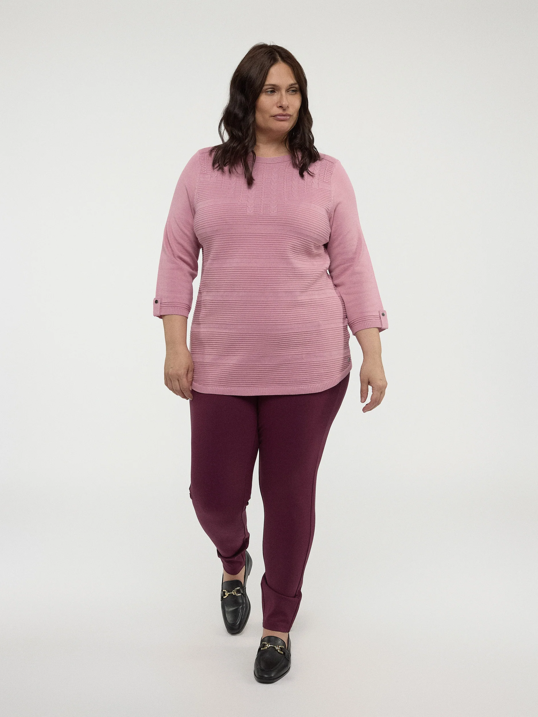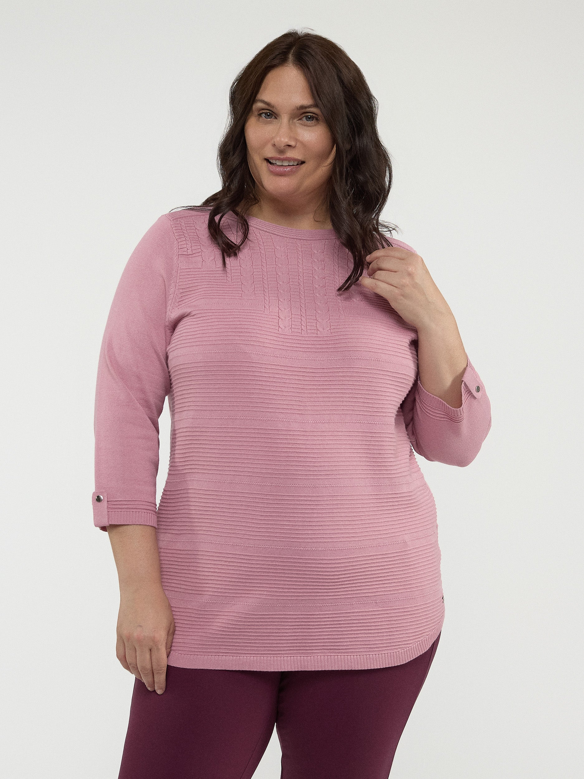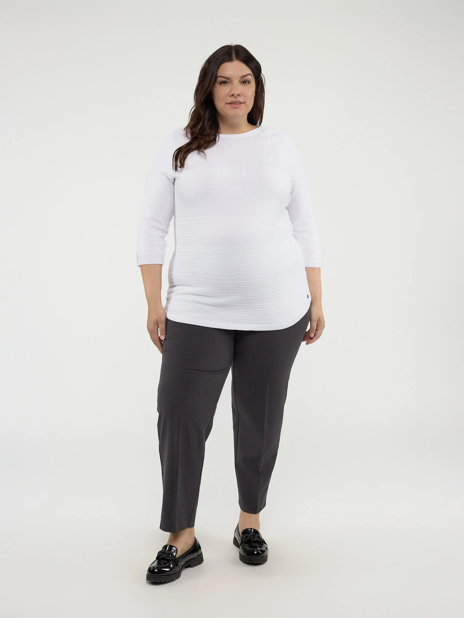 Ce chandail classique et équilibré s’associe parfaitement à un jean ou à une jupe pour un look intemporel.