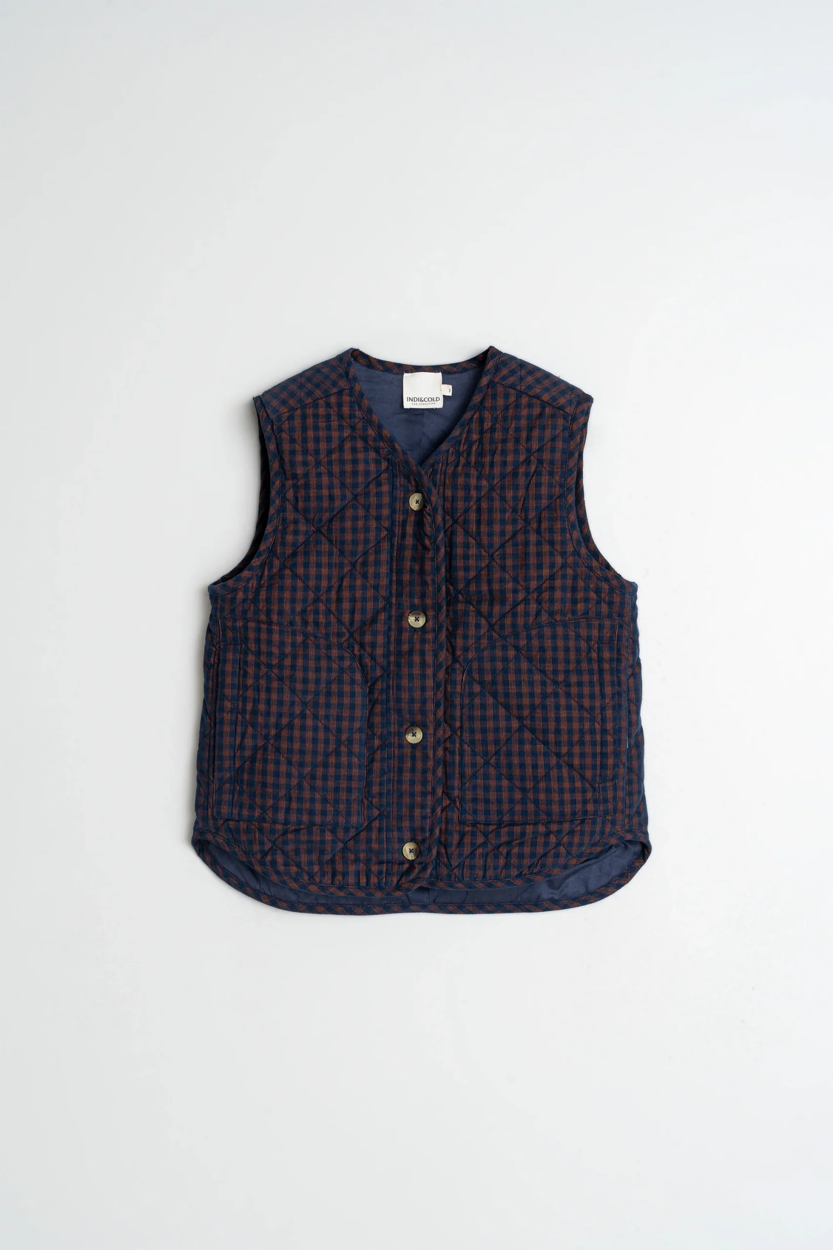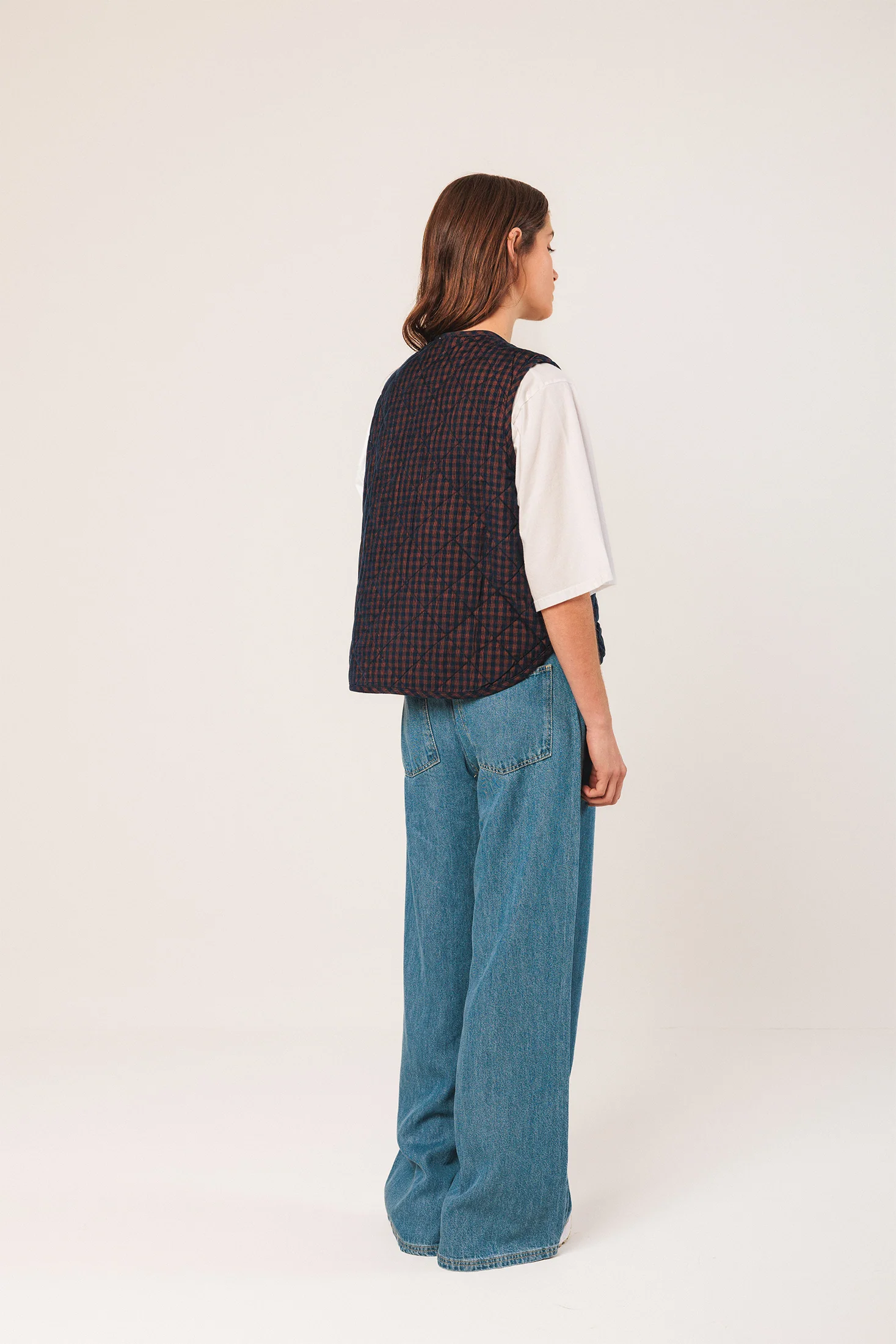Quilted vest in micro-corduroy with a Vichy motif. It features a boxy cut, and the back is slightly longer than the front. Perfect for those in-between days when the temperature drops.