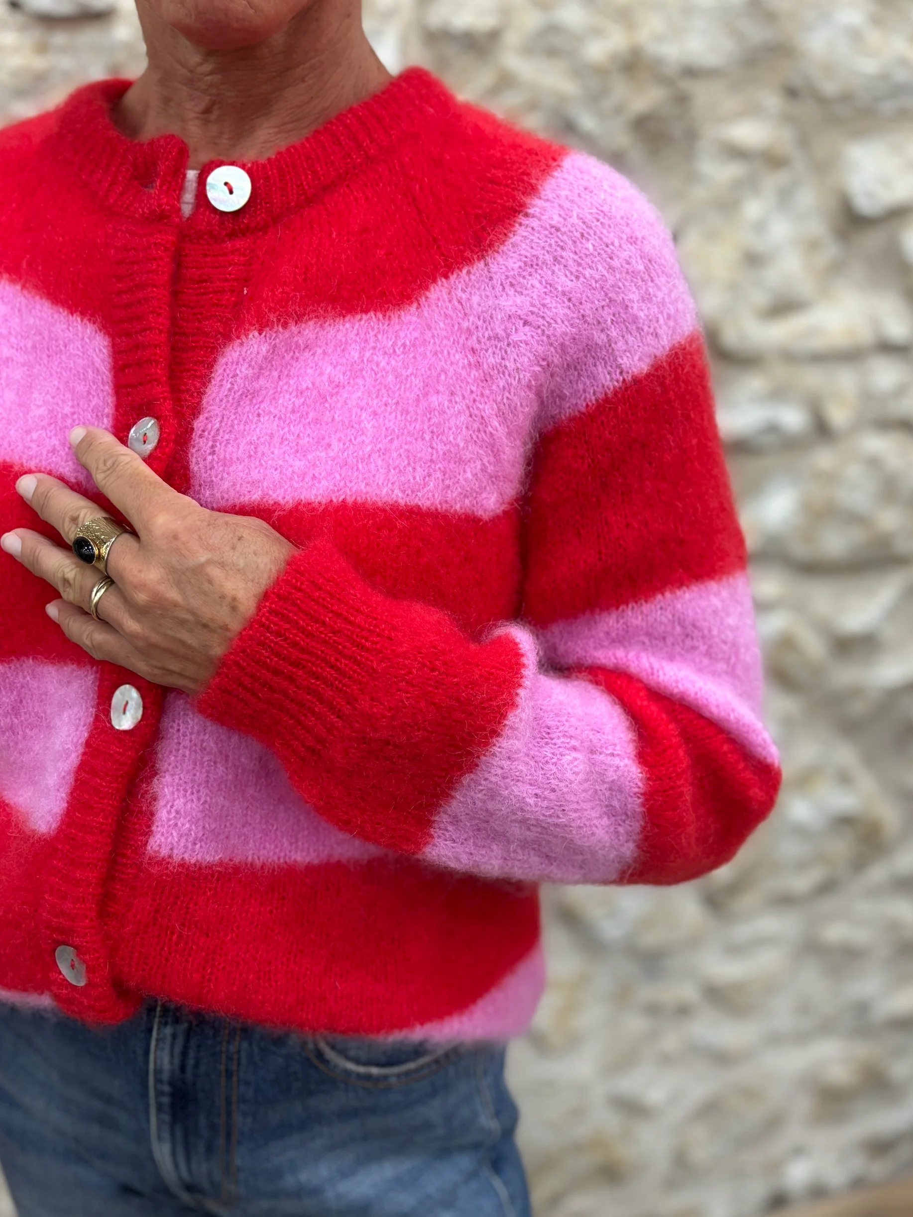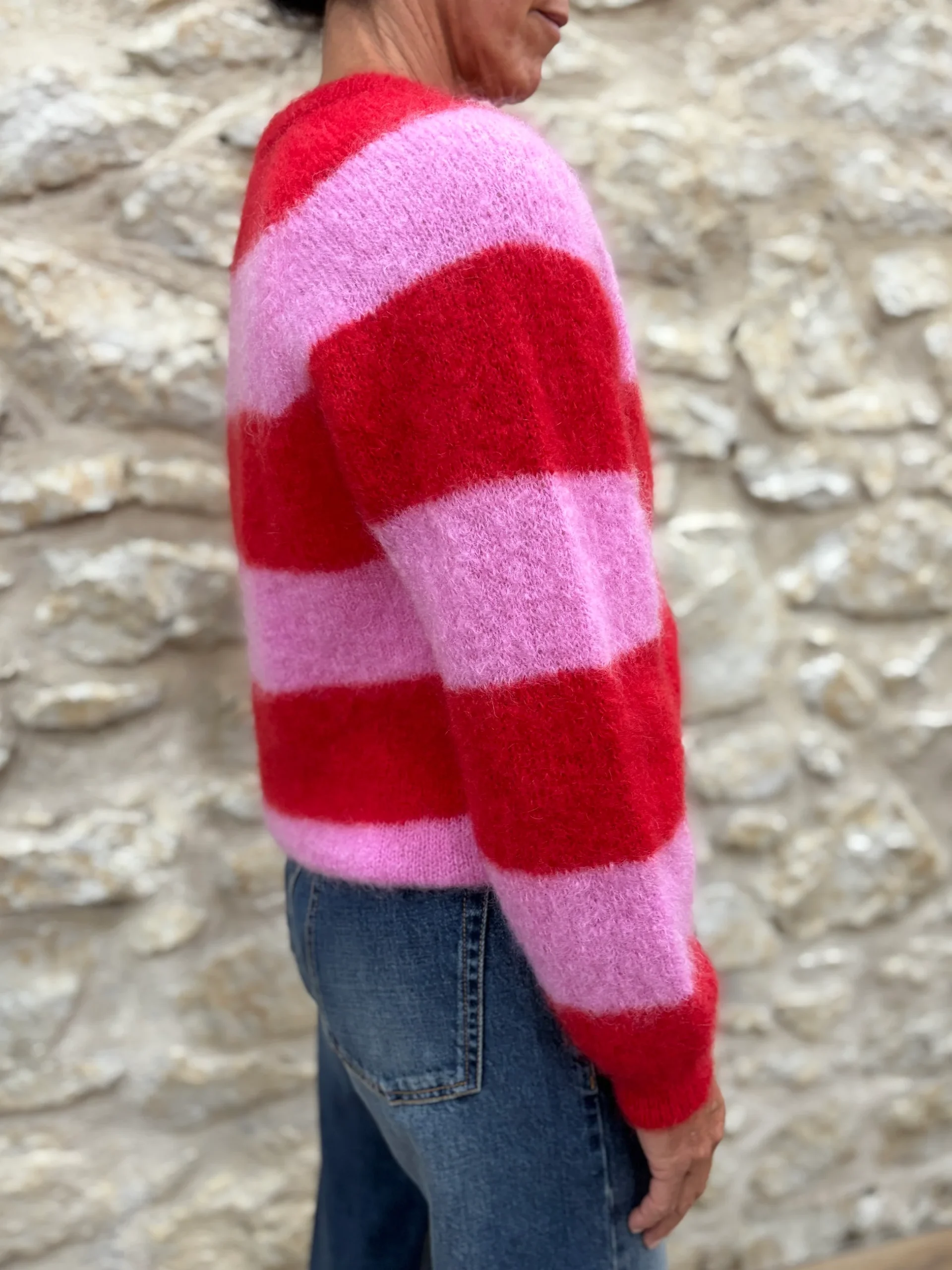 Matières : Mohair, polyamide & élasthanne Coupe : Coupe cardigan large Forme du col : Col rondLongueur des manches : Manches longuesCouleurs / Motifs : Rayures roses et rouges Notre modèle porte une taille 0 et mesure 165 cm. Nom du modèle : ALICEMarque : LES TRICOTS D’O Conseils d’entretien : Lavage à la main.Informations […]