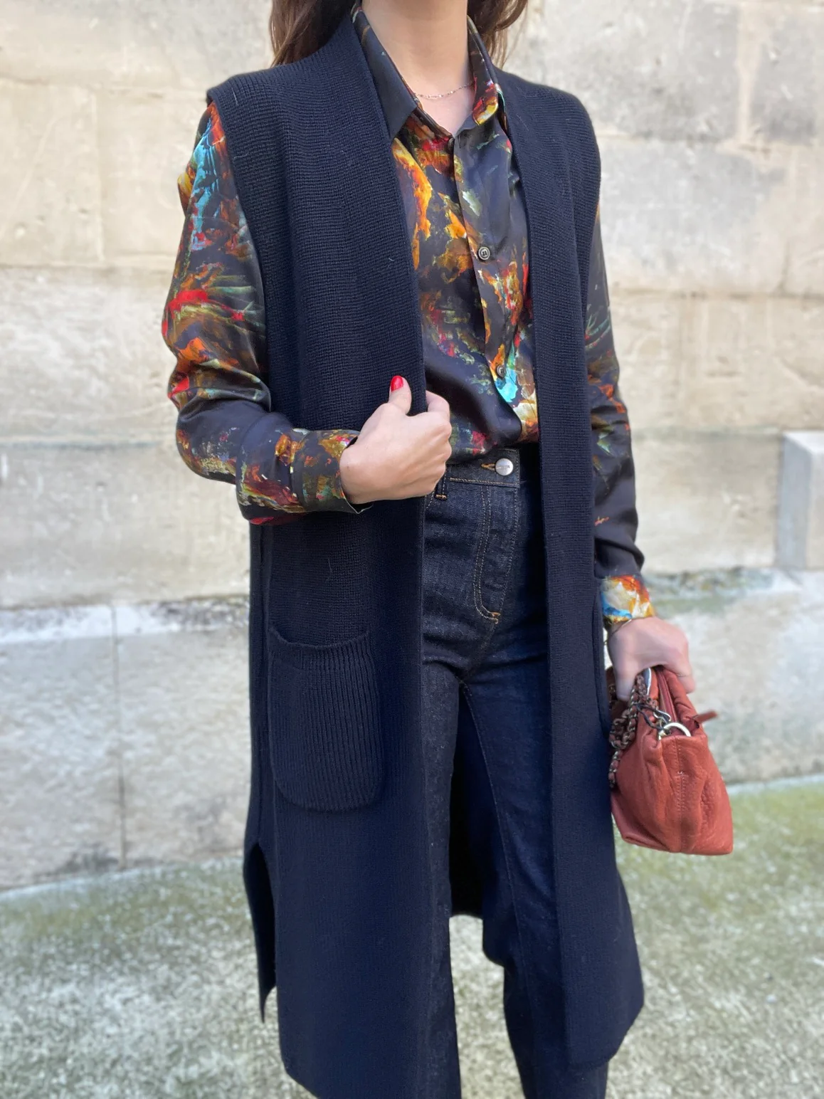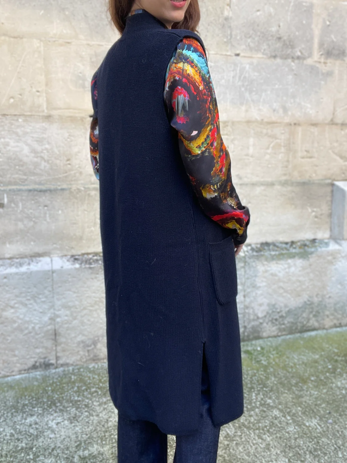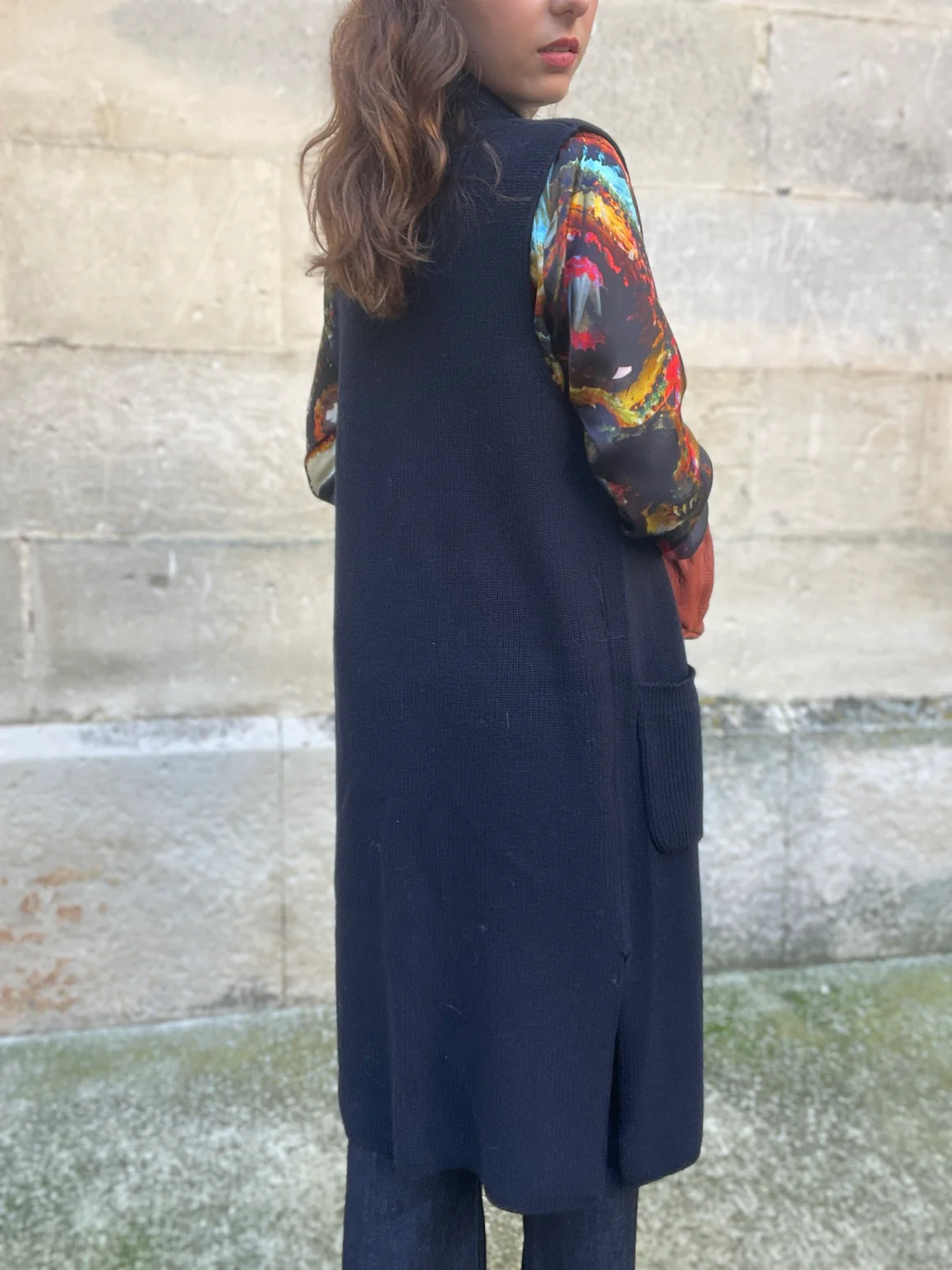 Coupe : Gilet long coupe droite avec poches plaquées sur le devant.