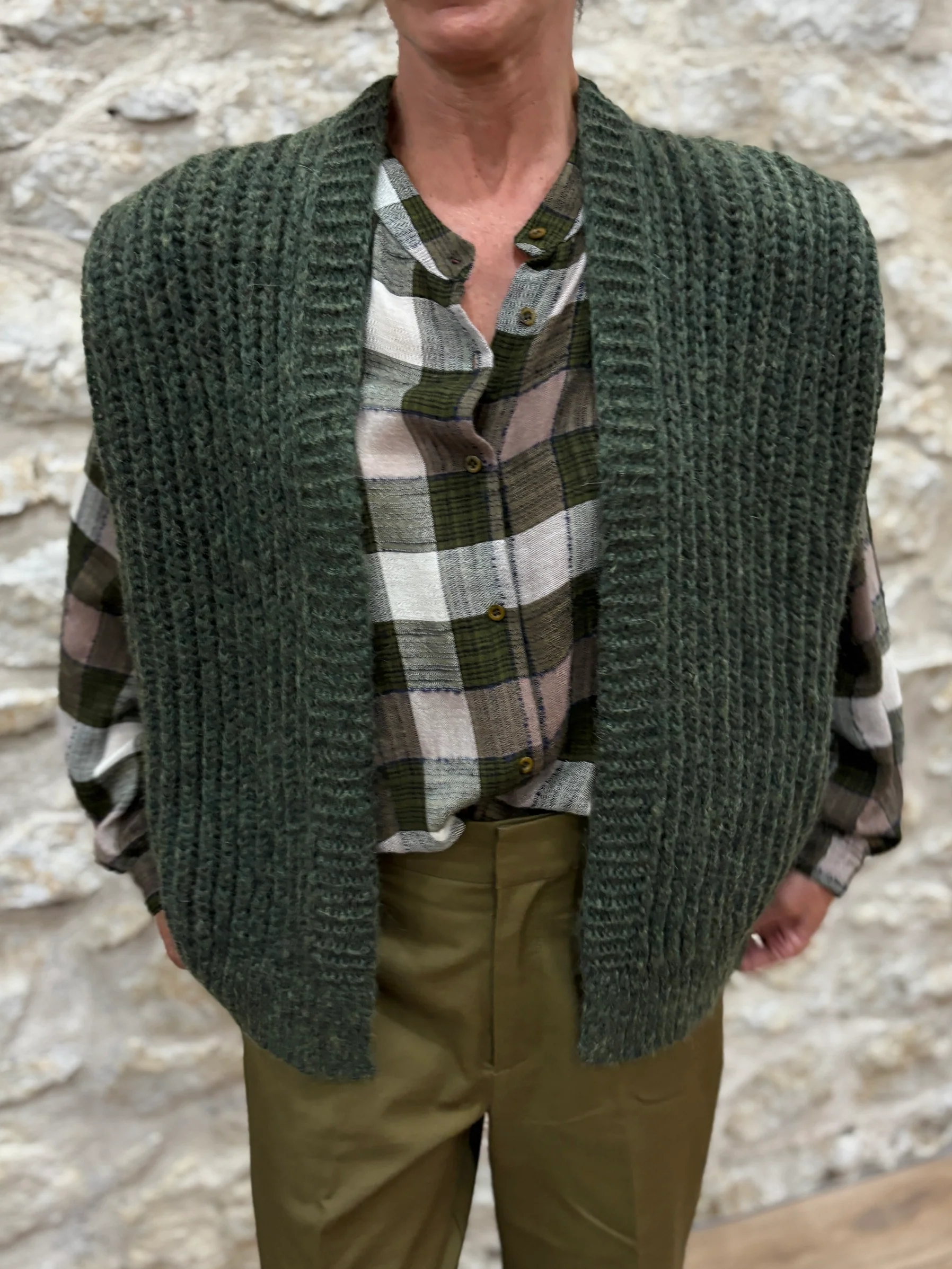 Matières : Alpaga, laine, polyamide et élasthanne. Coupe : Coupe largeLongueur des manches : Sans manchesCouleurs / Motifs : Vert Notre modèle porte une taille UNIQUE et mesure 165 cm. Nom du modèle : STELLAMarque : LES TRICOTS D’O Conseils d’entretien : Lavage à la mainInformations supplémentaires : Convient du XS au XL