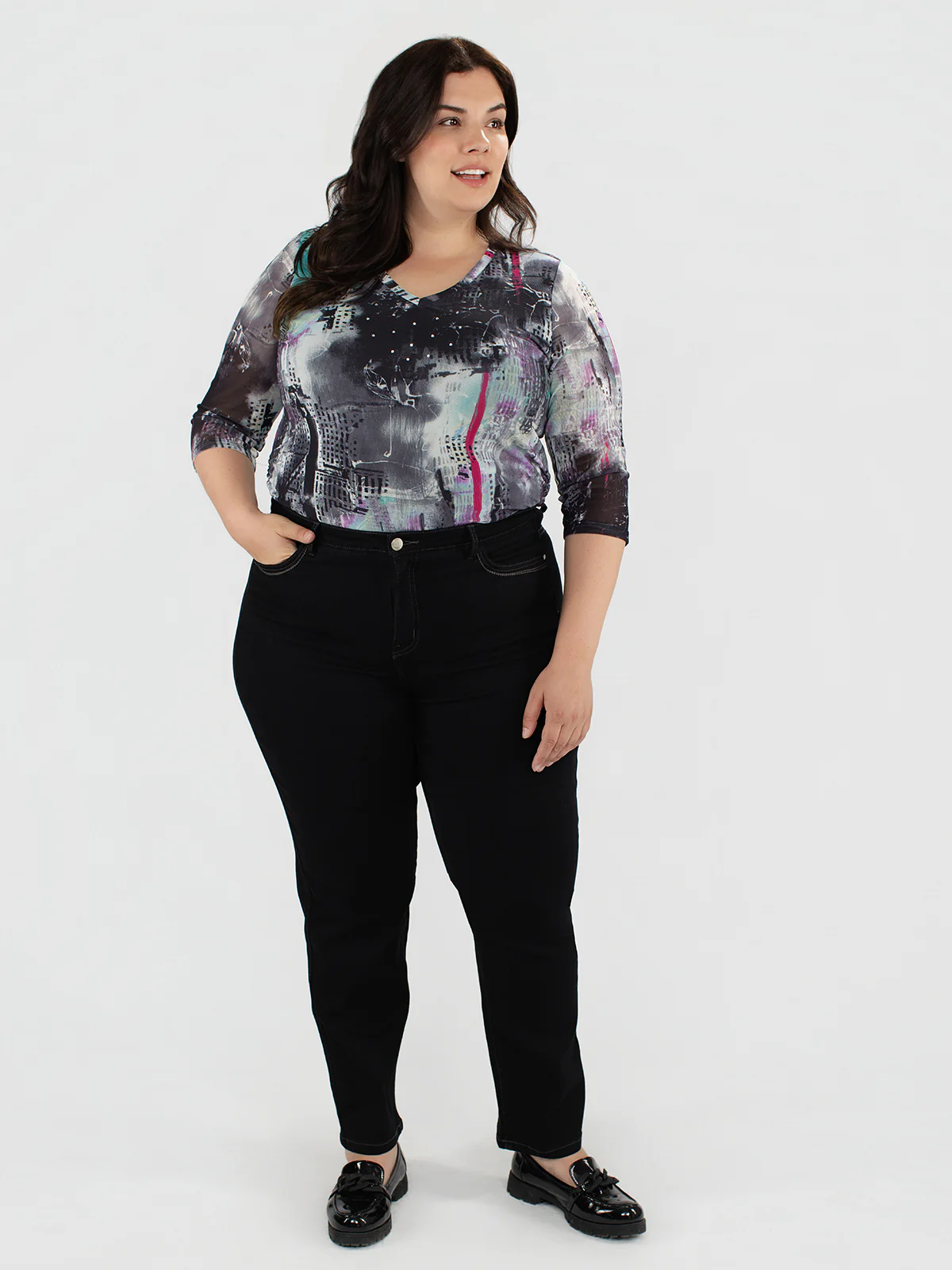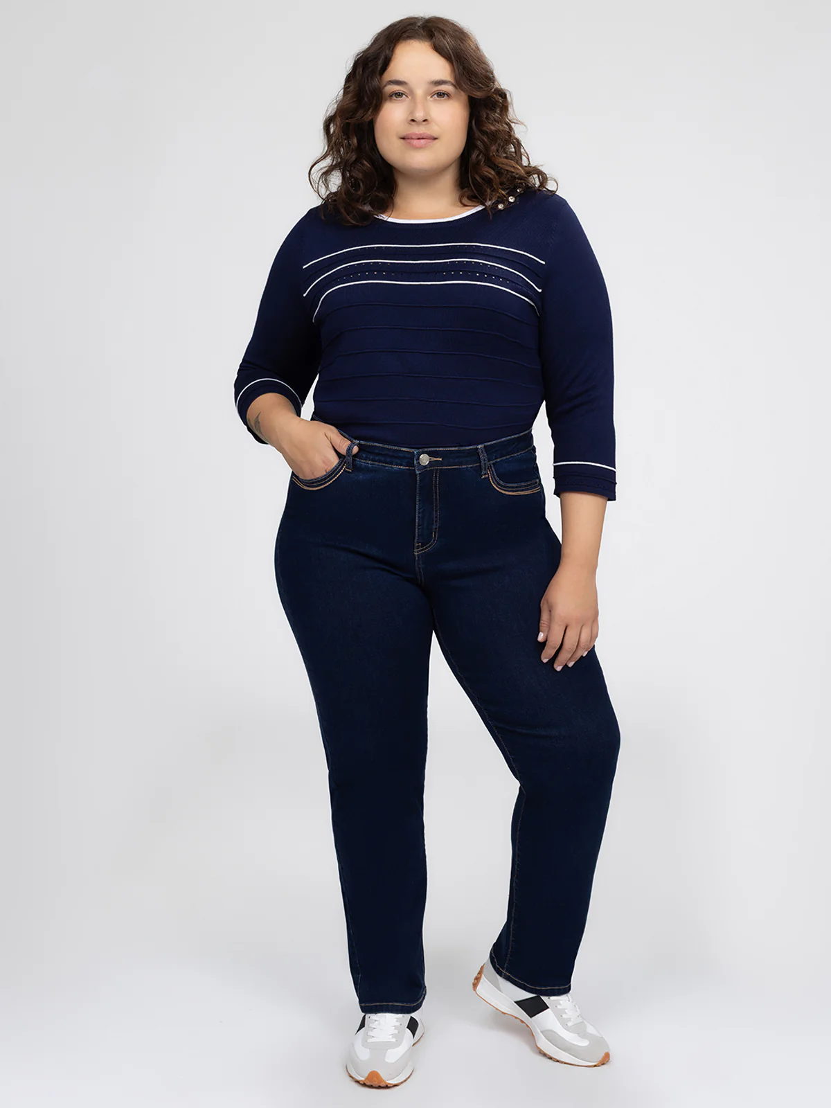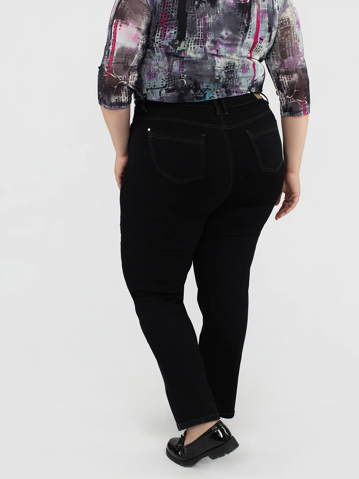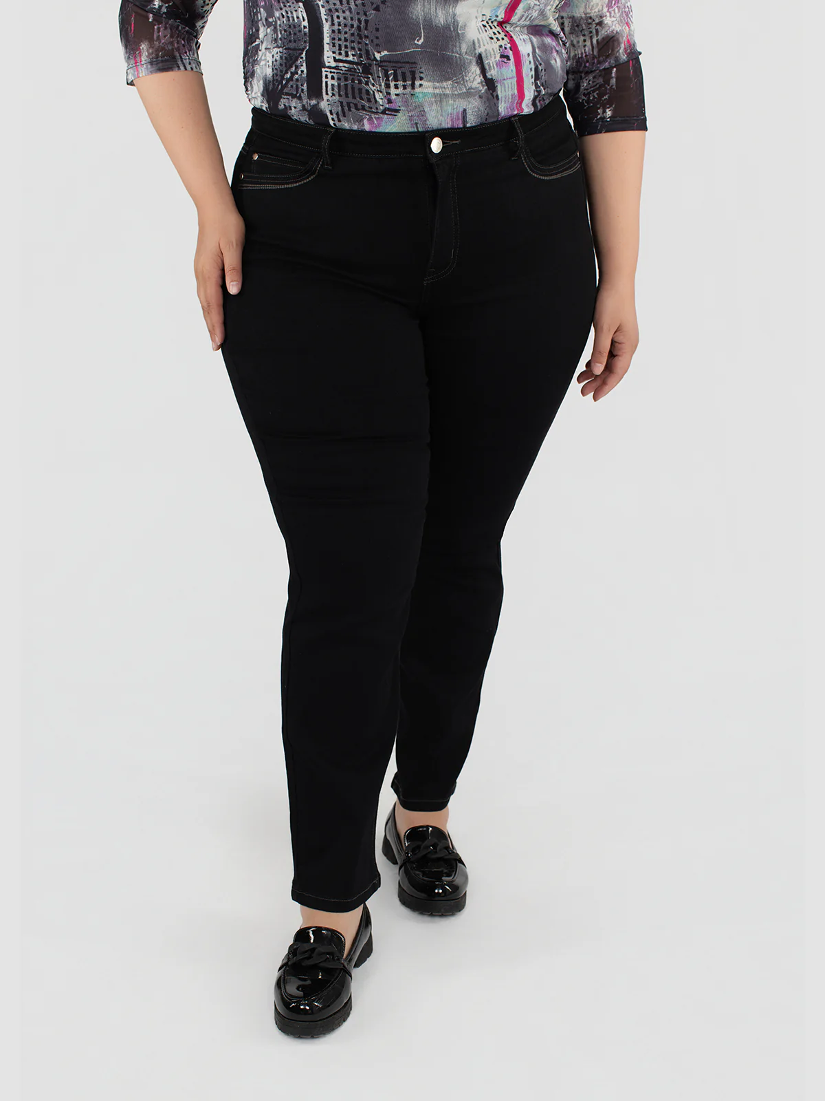 Jean taille plus semi-ajusté avec structure classique à braguette et poches avant et arrière. Surpiqûres visibles qui soulignent les lignes du modèle.