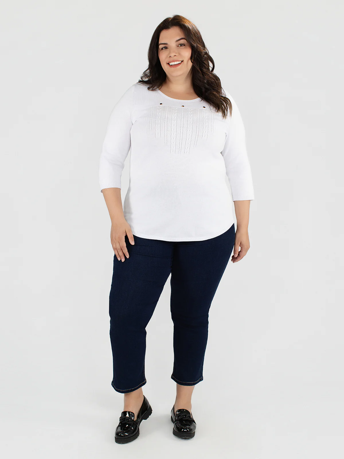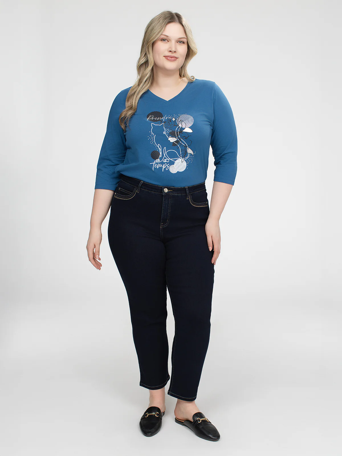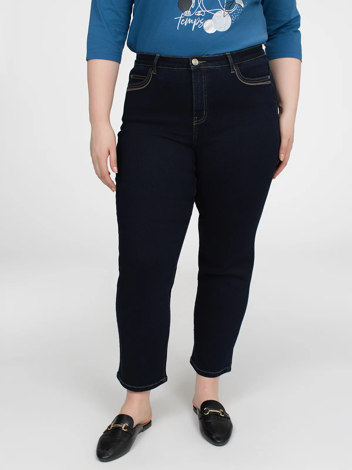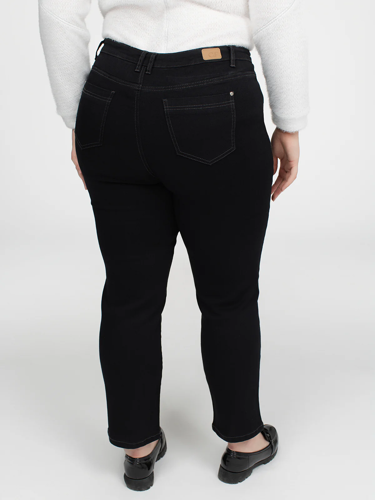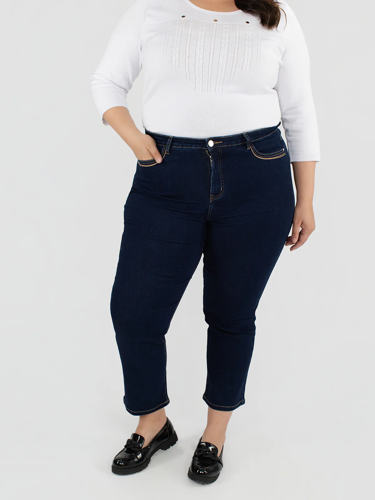 Jean droit taille plus à jambe semi-ajustée avec surpiqûres contrastantes et passants à la taille. Poches avant et arrière fonctionnelles, fermoir bouton et braguette classique.