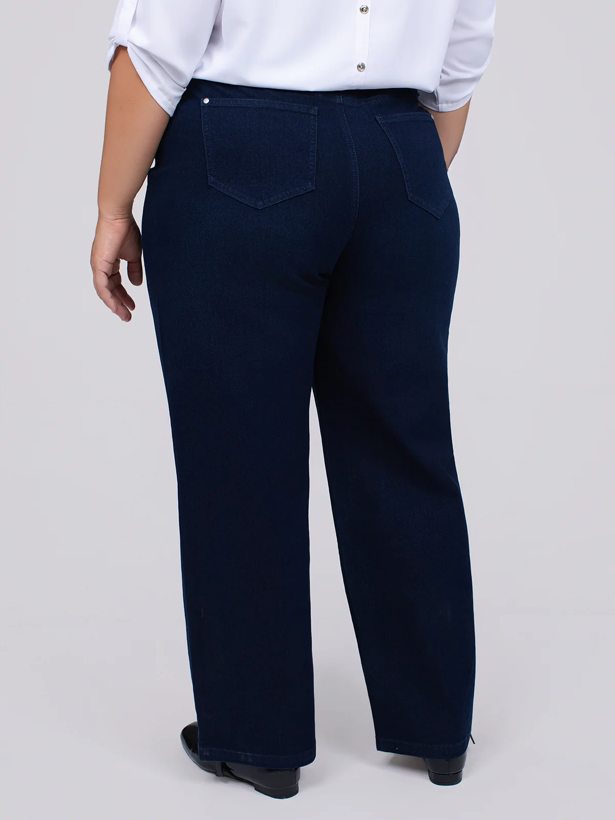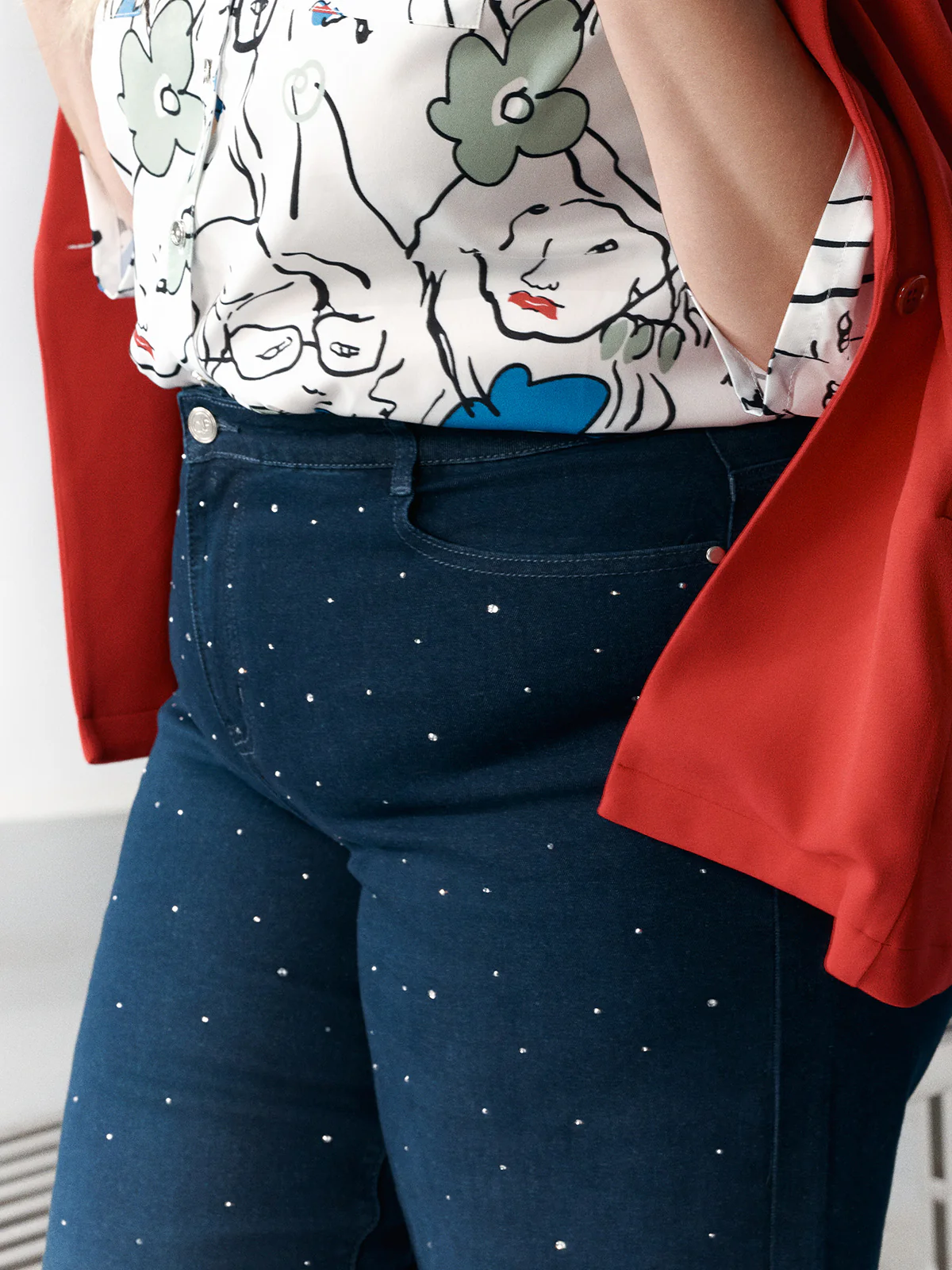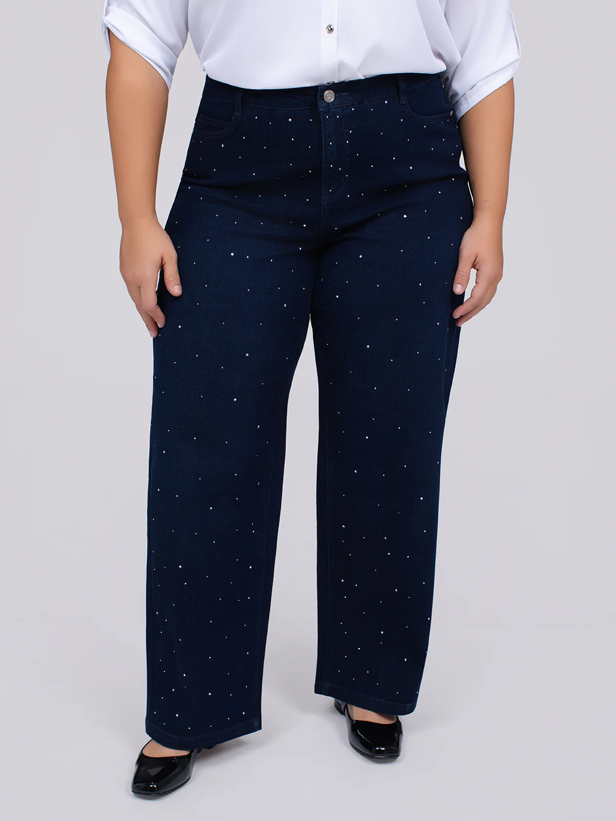 Jean large semi-ajusté en denim en bleu foncé doté de petites pierres brillantes avec une coupe droite et 2 poches avant et arrière.