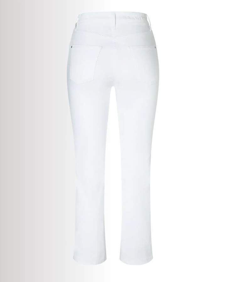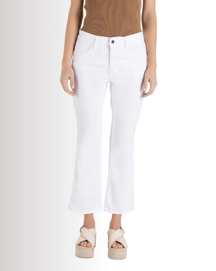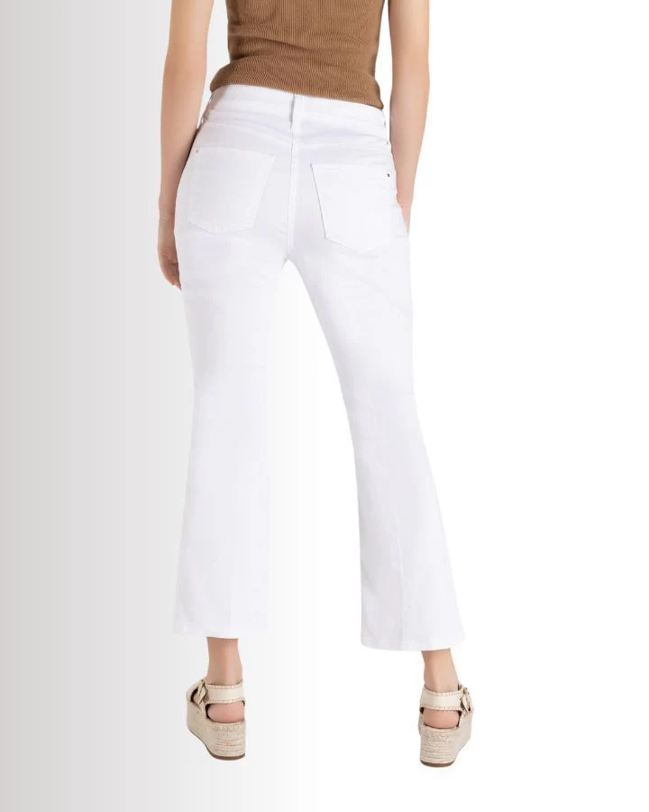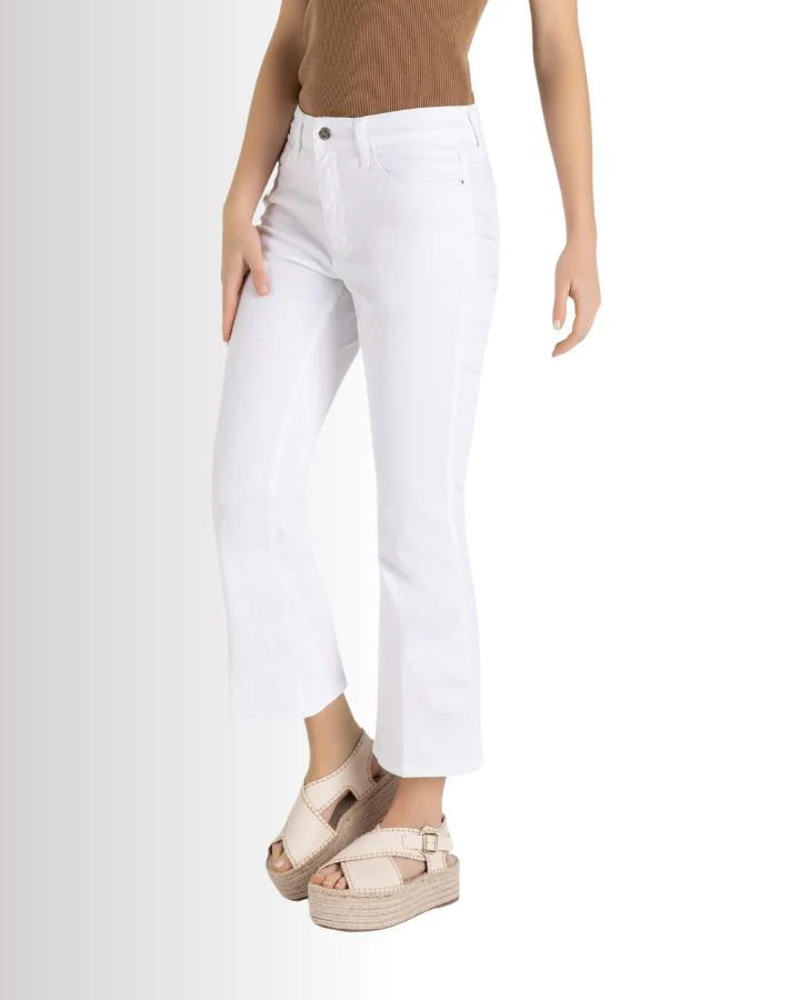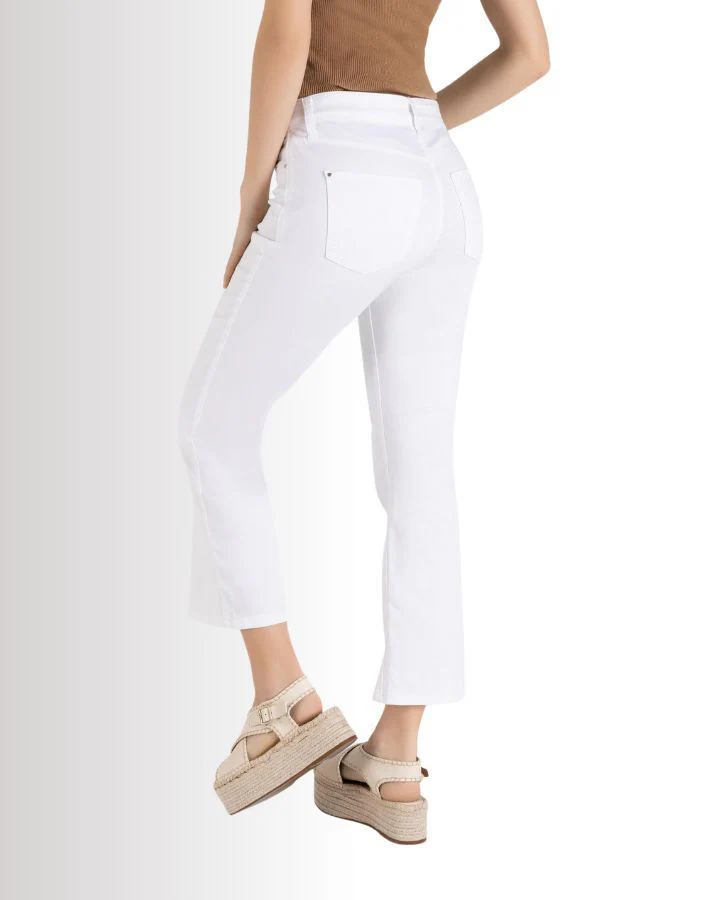 Ce pantalon blanc présente une coupe évasée et arrive juste au niveau des chevilles. Sa taille haute flatte la silhouette et assure un maintien optimal. Confectionné dans un tissu léger et confortable, il est idéal pour les journées chaudes. Le pantalon est équipé d’une fermeture à bouton et à glissière, ainsi que de poches fonctionnelles à l’avant et à l’arrière. Parfait pour être associé à un haut chic ou décontracté, ce pantalon polyvalent est une pièce indispensable pour une garde-robe stylée.