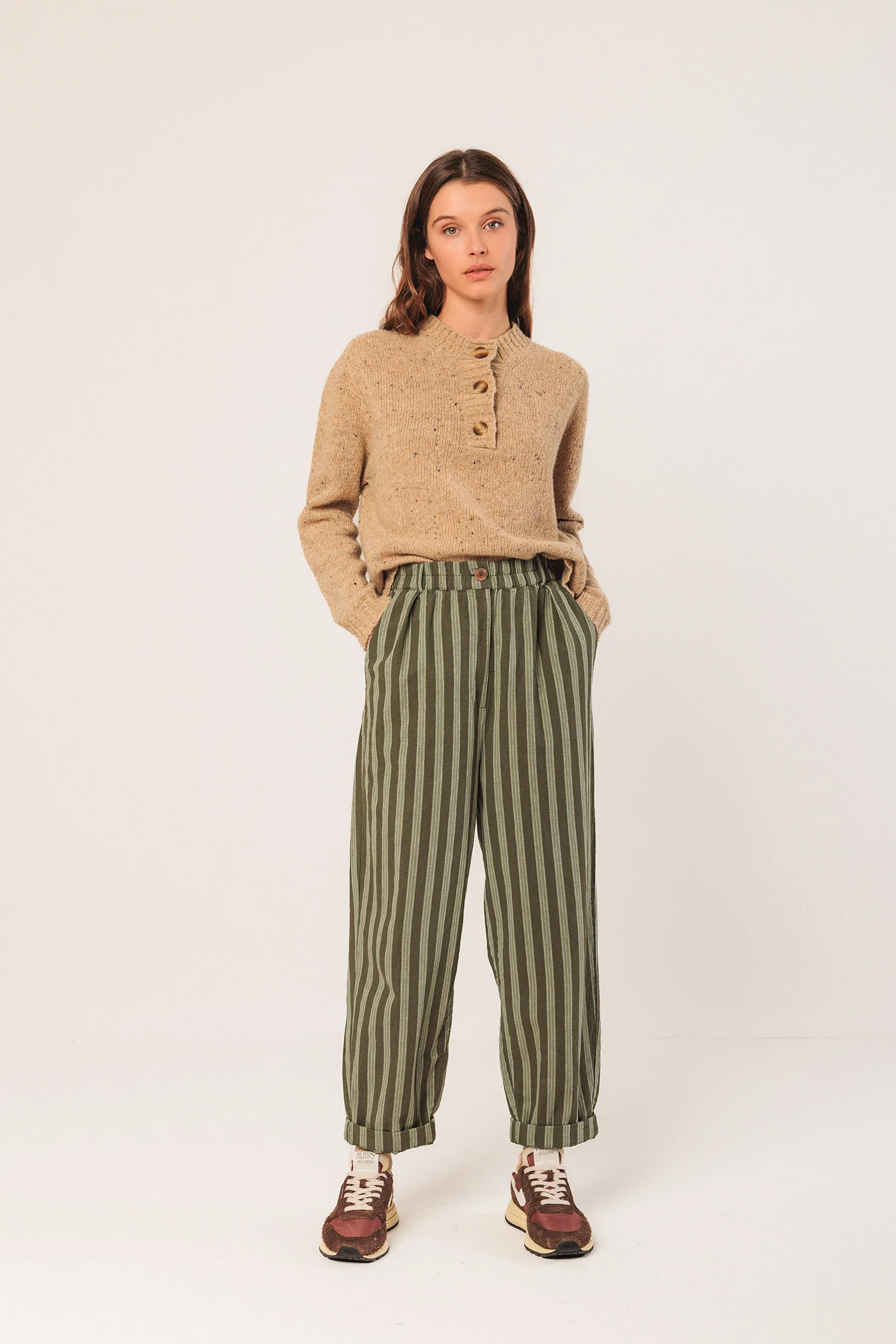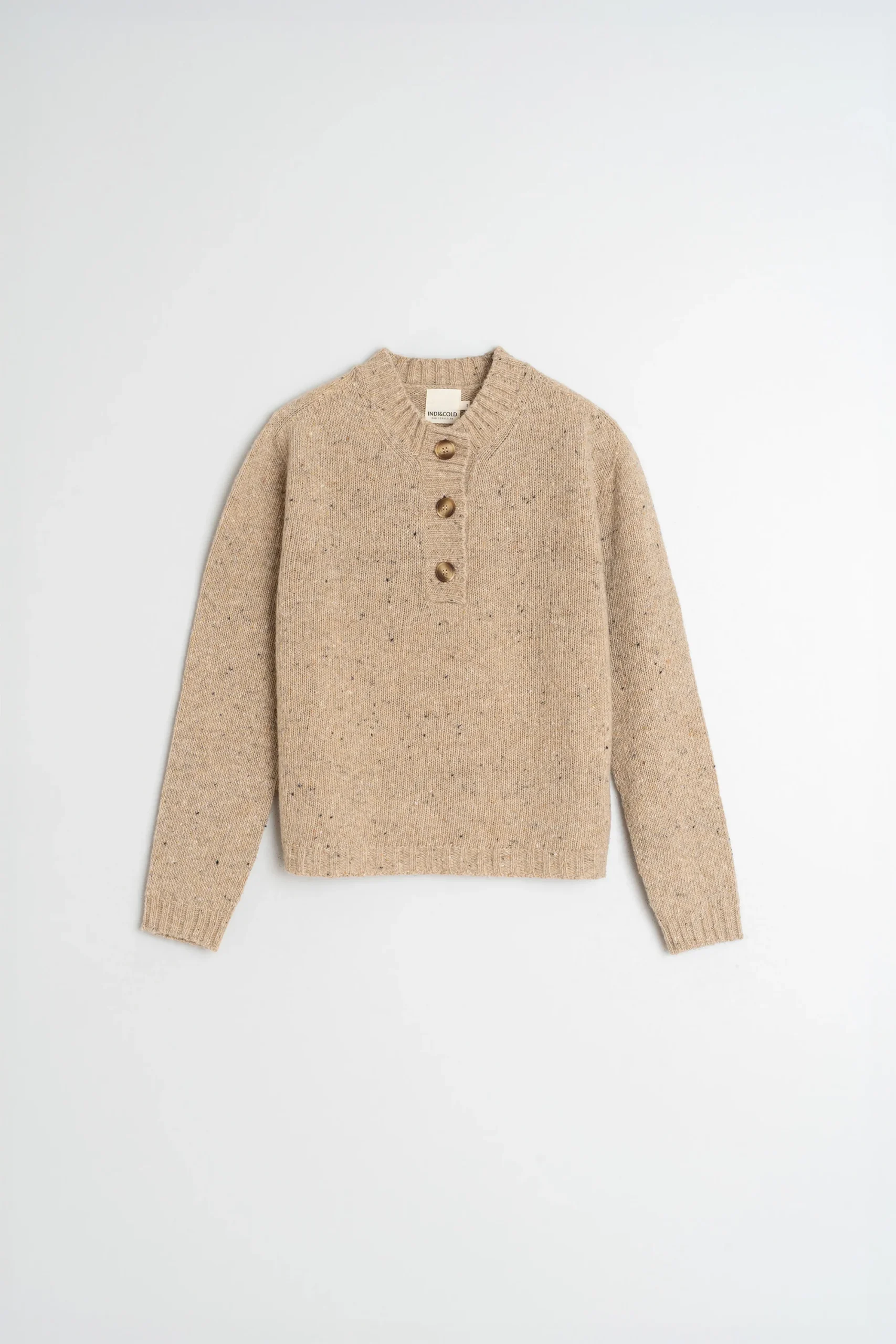Un jersey de cuello perkins abotonado de media tapeta estiliza, es de lana y con efecto neps. Fit relajado.
