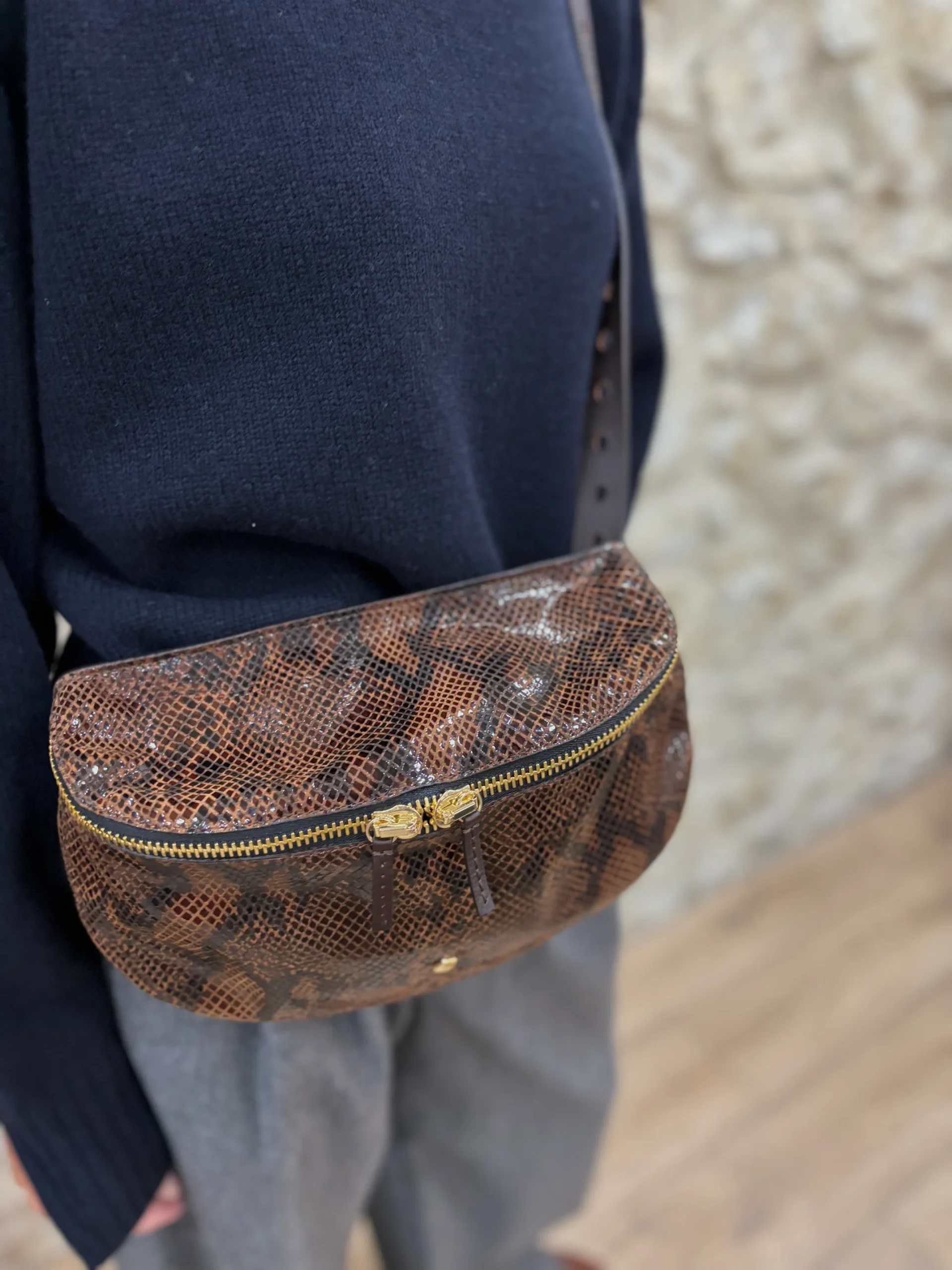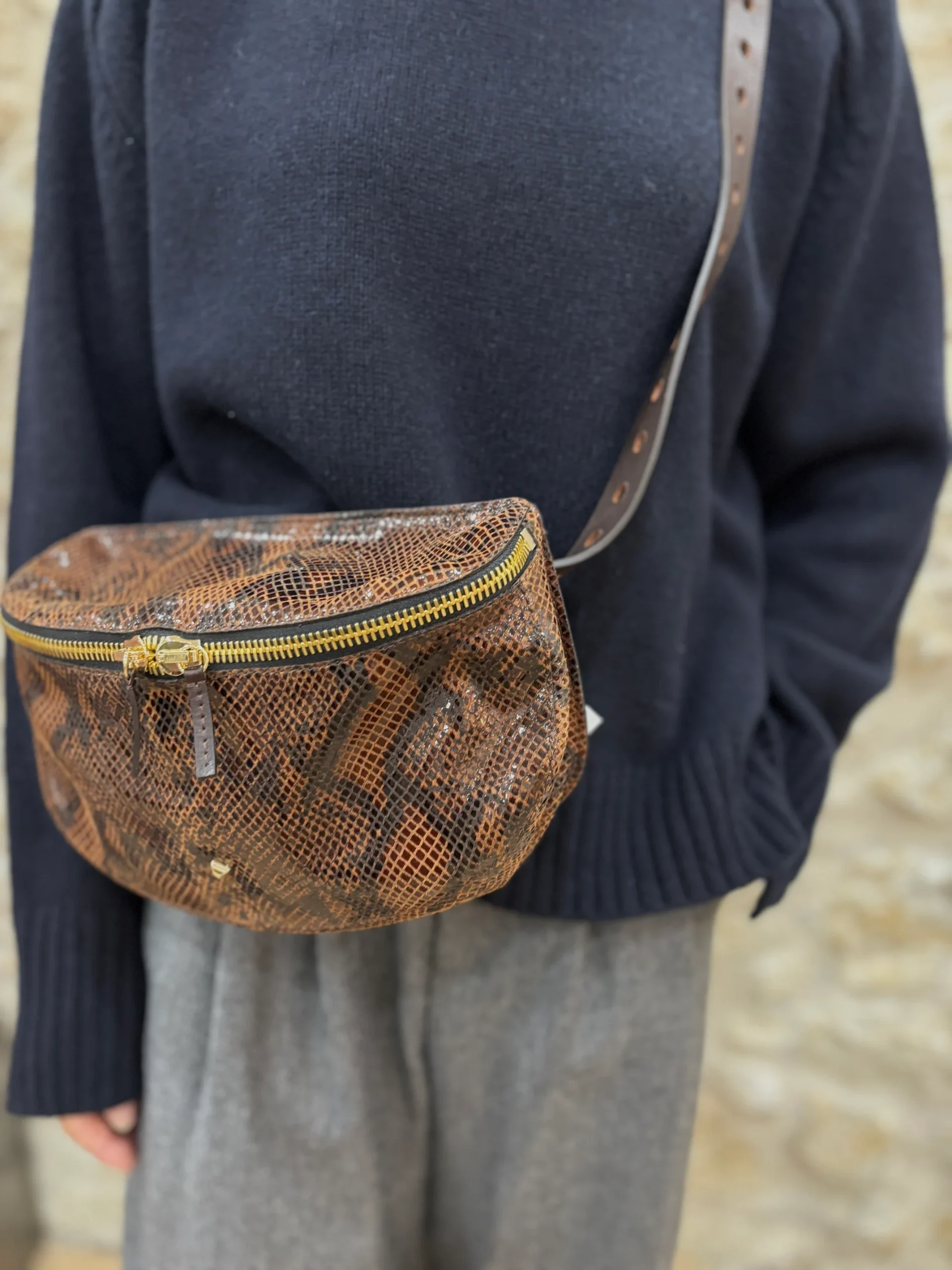 Matières extérieures : Cuir Compartiments : Un seul compartiment avec une fermeture à glissière à double curseurAnses / Bandoulières : Une bandoulière réglable (115 cm max)Motif / Couleur : Imprimé animalierDimensions : 26 x 18 x 8.5 cm Nom du modèle : LA GRANDE LILIMarque : HERBERT FRÈRE SOEUR