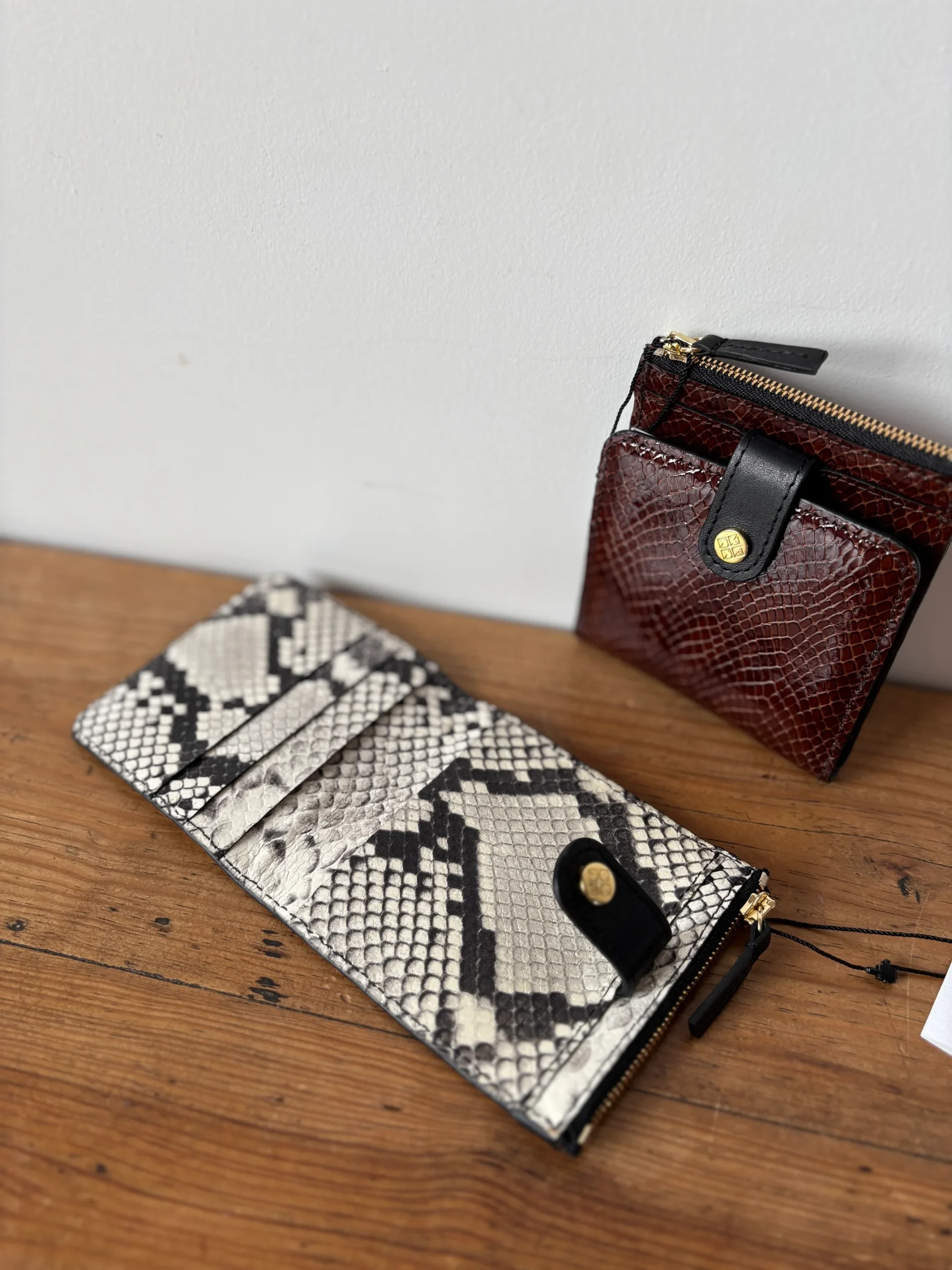 Matières extérieures : CuirDoublure : Cuir Compartiments : Un compartiment zippé, et plusieurs fentes pour les cartes fermées par un bouton pression.Motif / Couleur : Imprimé animalier bordeaux et gris Nom du modèle : LE PARIS LISBONNEMarque : HERBERT FRÈRE SOEUR