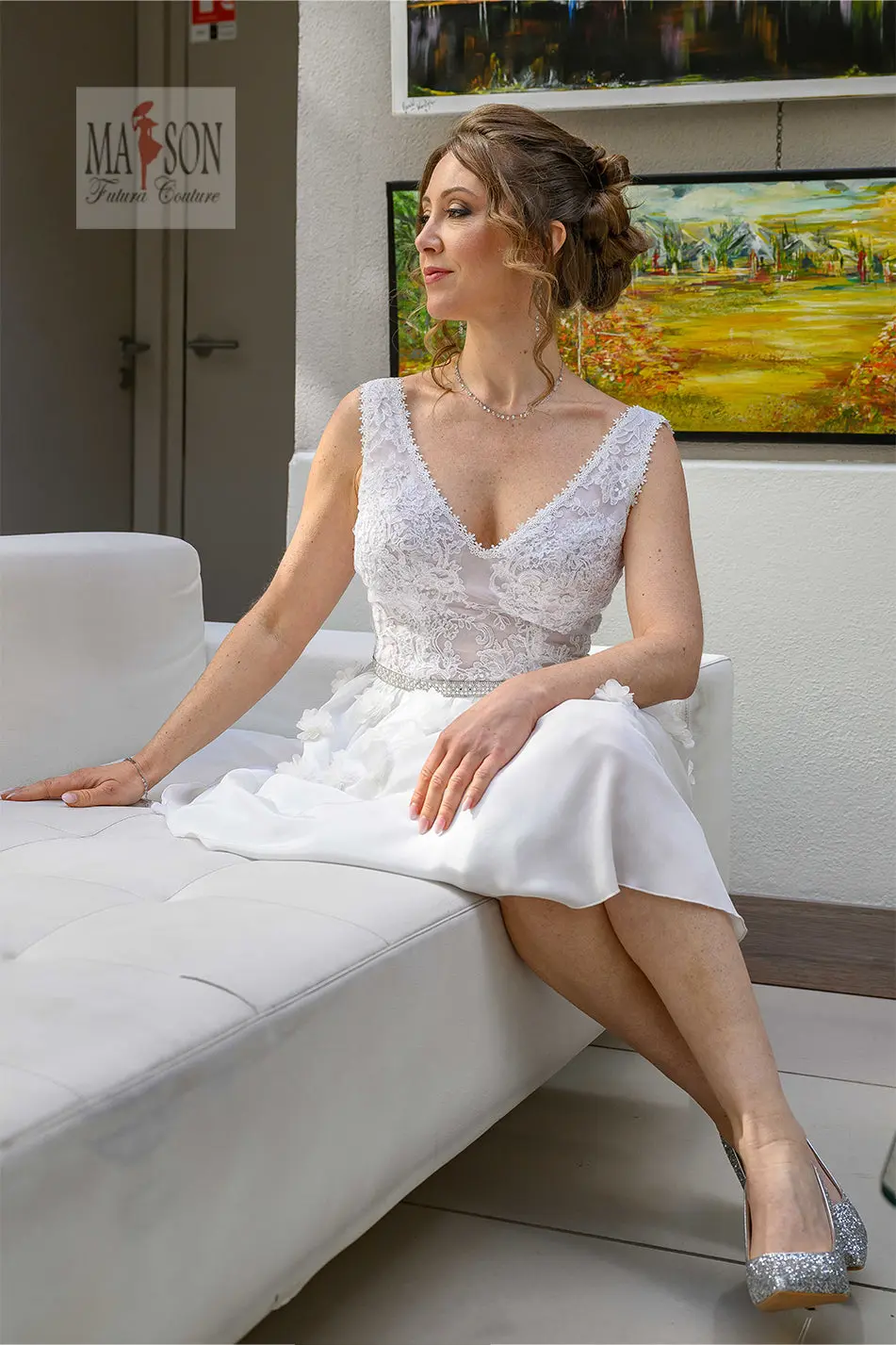 Idéale pour une cérémonie civile, un mariage en plein air ou une réception estivale, cette robe de mariée courte séduit par sa délicatesse et sa légèreté. Le haut en dentelle de Calais sublime le buste avec son décolleté en V raffiné, tandis que la jupe en mousseline de soie s’anime de fleurs en relief, apportant une touche poétique et romantique. Élégante sans en faire trop, cette création incarne la mariée moderne : libre, rayonnante, et naturellement chic.