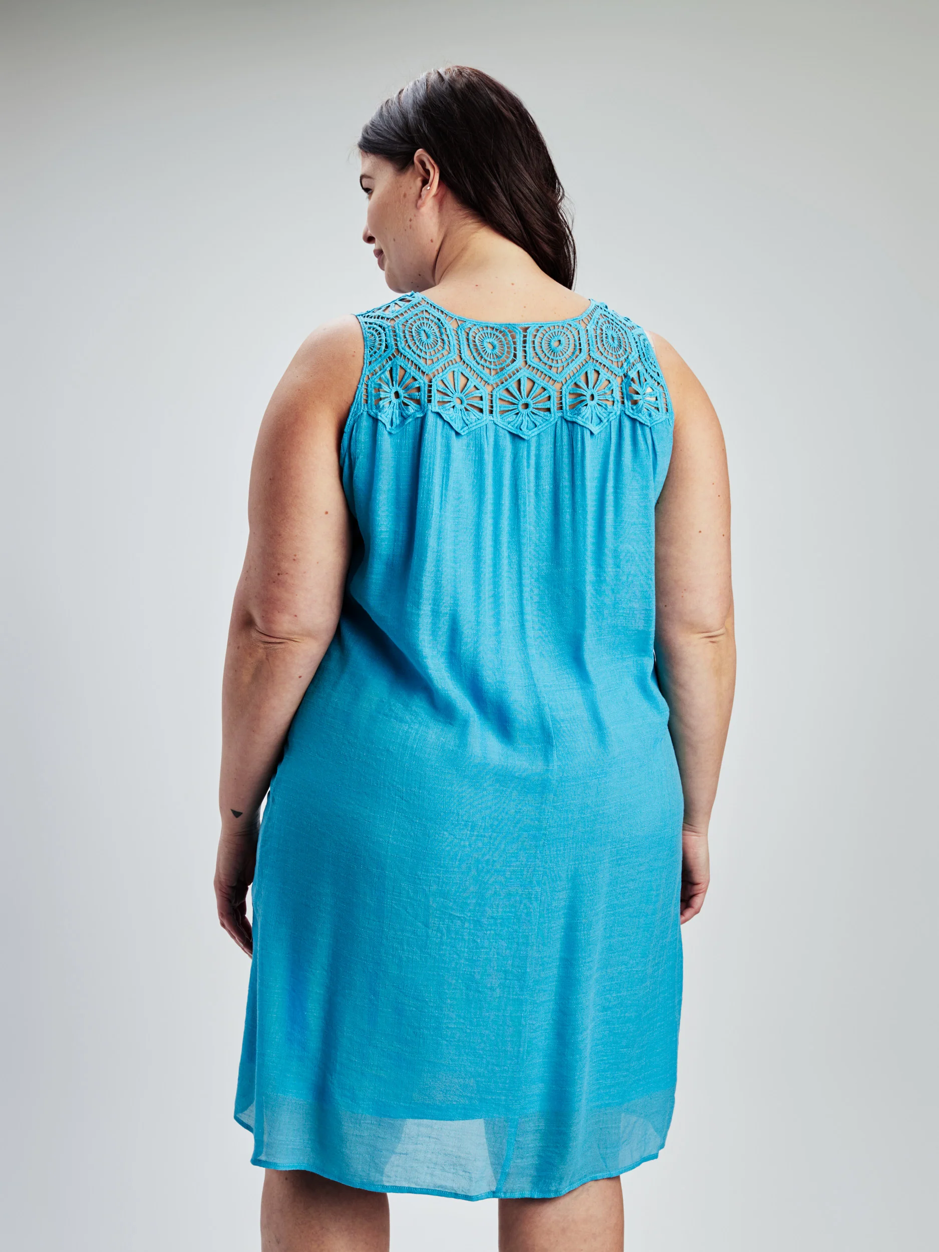 Cette robe midi sans manches présente un empiètement de dentelle le long de l’encolure. Facile à associer à des sandales ou des talons pour toutes sortes d’occasions.