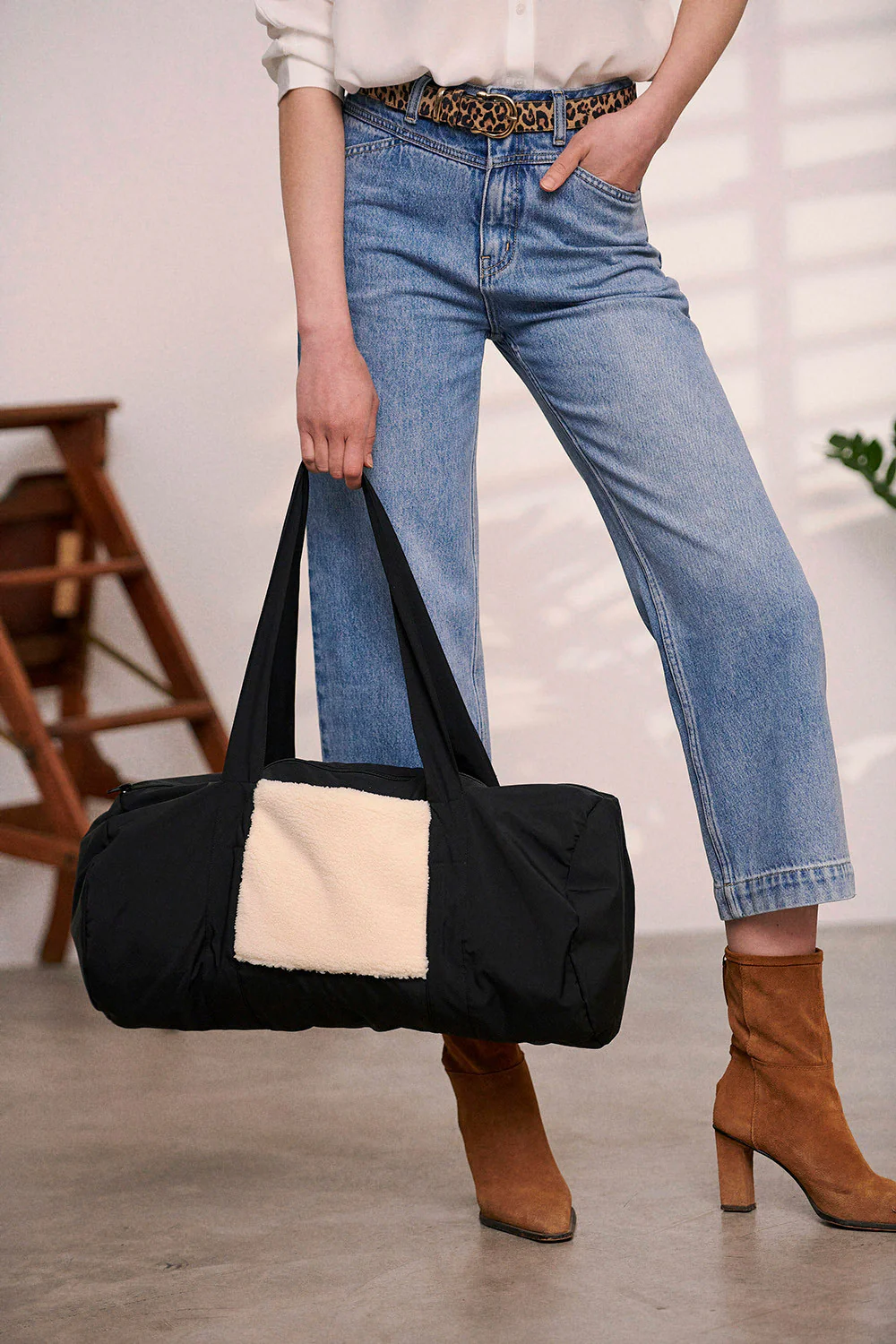– Sac polochon zippé sur le dessus – Deux grandes lanières plaquées – Poche extérieure insérée entre les deux lanières en fausse fourrure – Poche intérieure – Entièrement doublé avec une double fantaisie – 40 cm de hauteur sans le zip et 51 cm de largeur Matière : Tissu principal 100% Polyester + Tissu secondaire […]