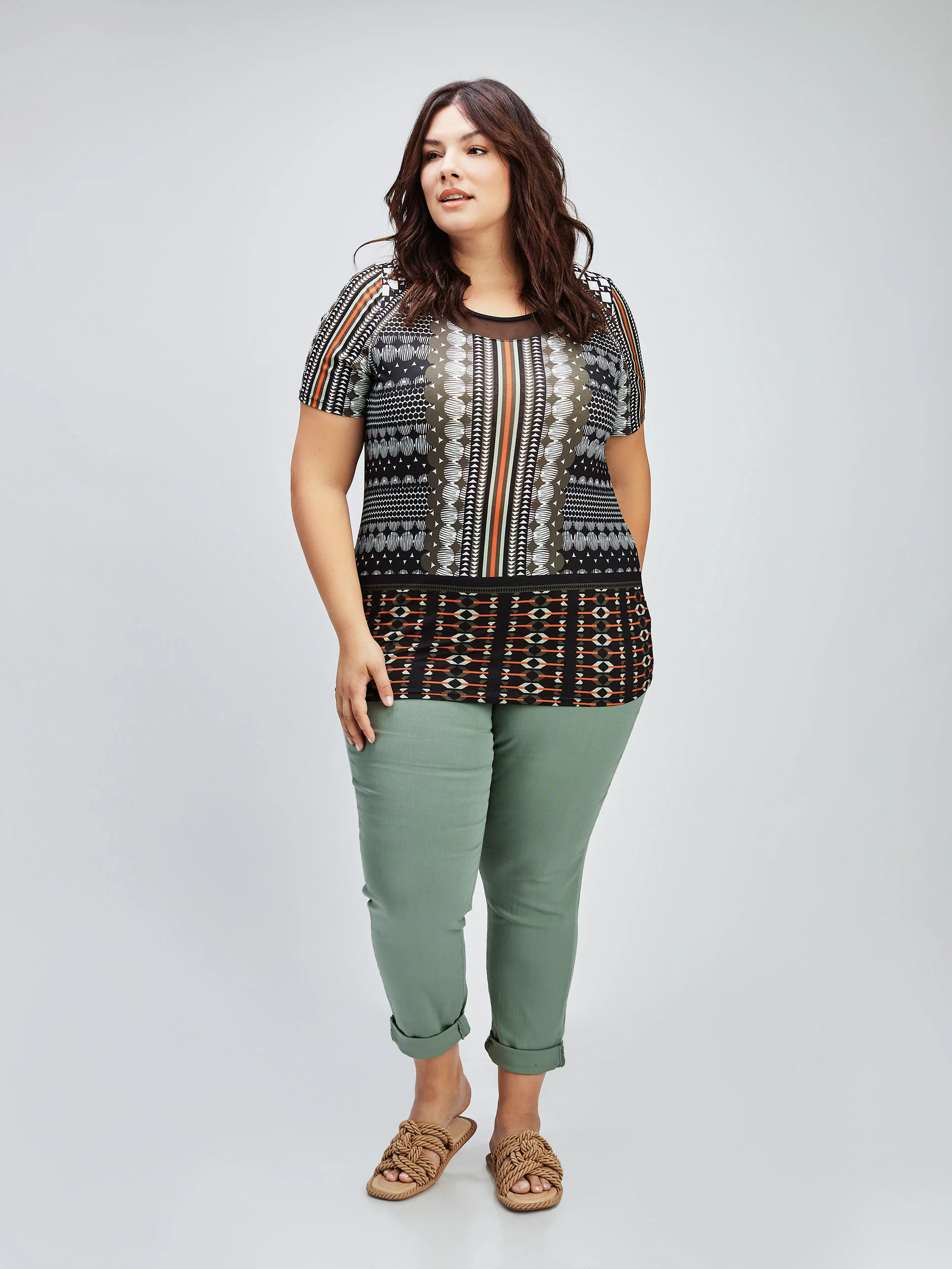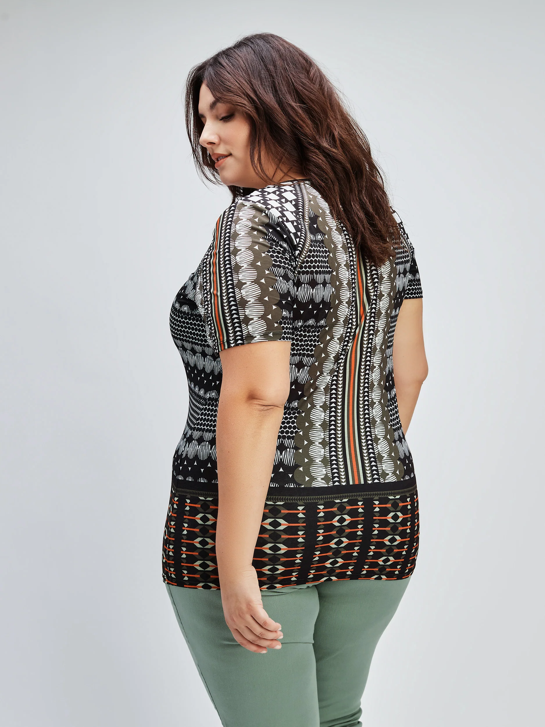 Ce t-shirt à manches courtes semi-ajusté présente un col rond élégant et un tissu léger avec un imprimé dans des tons neutres.
