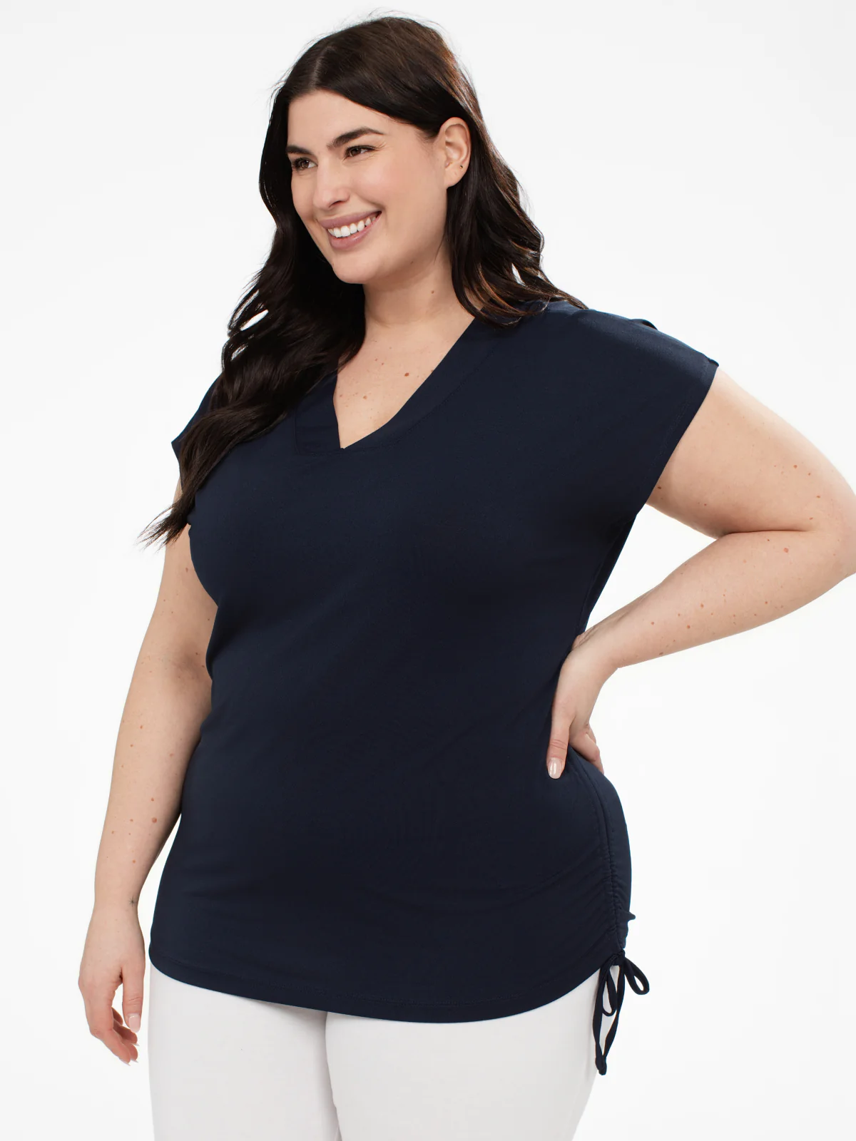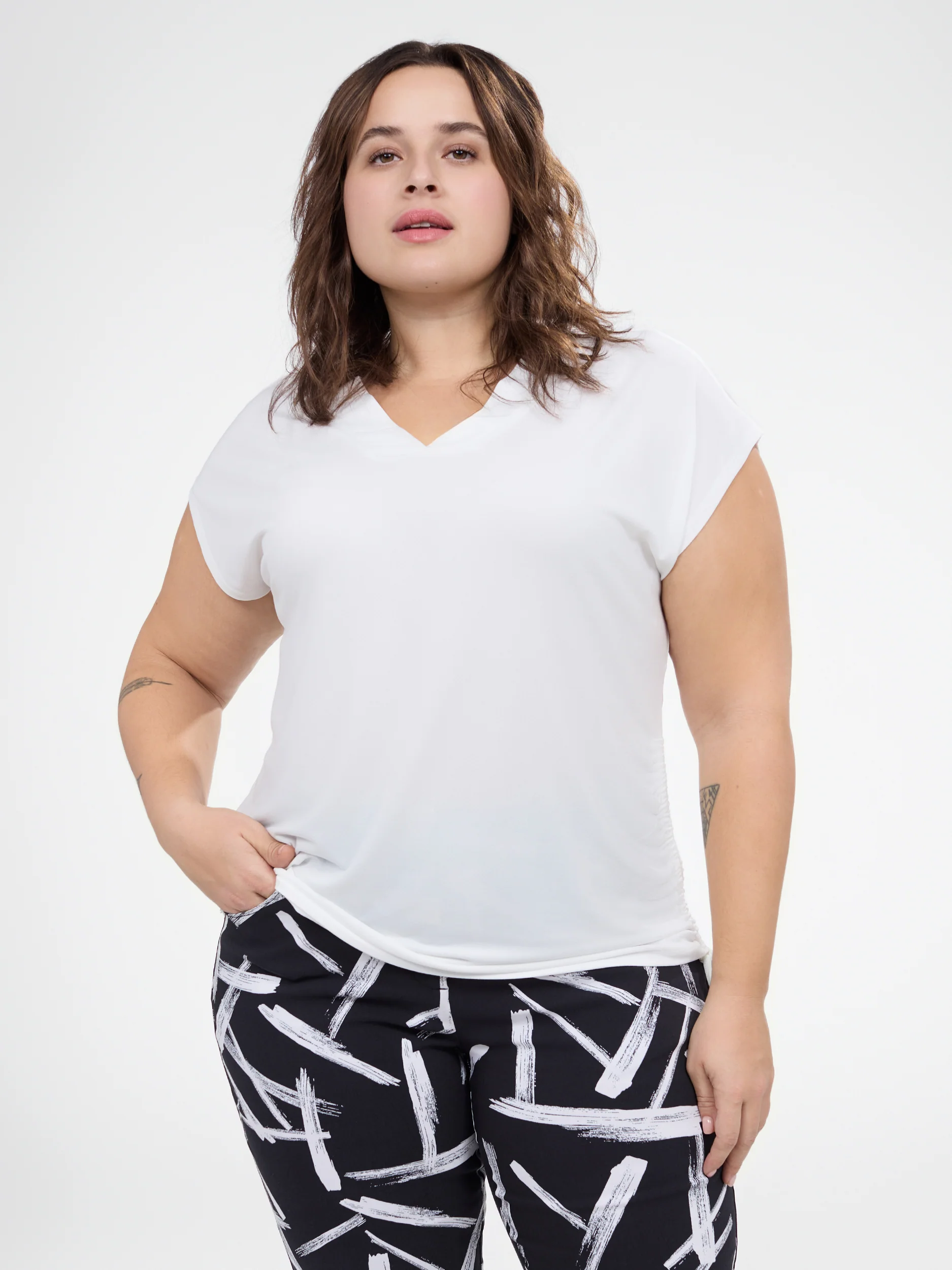 Un basique qui fait toute la différence ! Ce t-shirt taille plus séduit par sa coupe fluide et son col en V qui met en valeur le décolleté, parfait pour compléter n’importe quelle tenue.