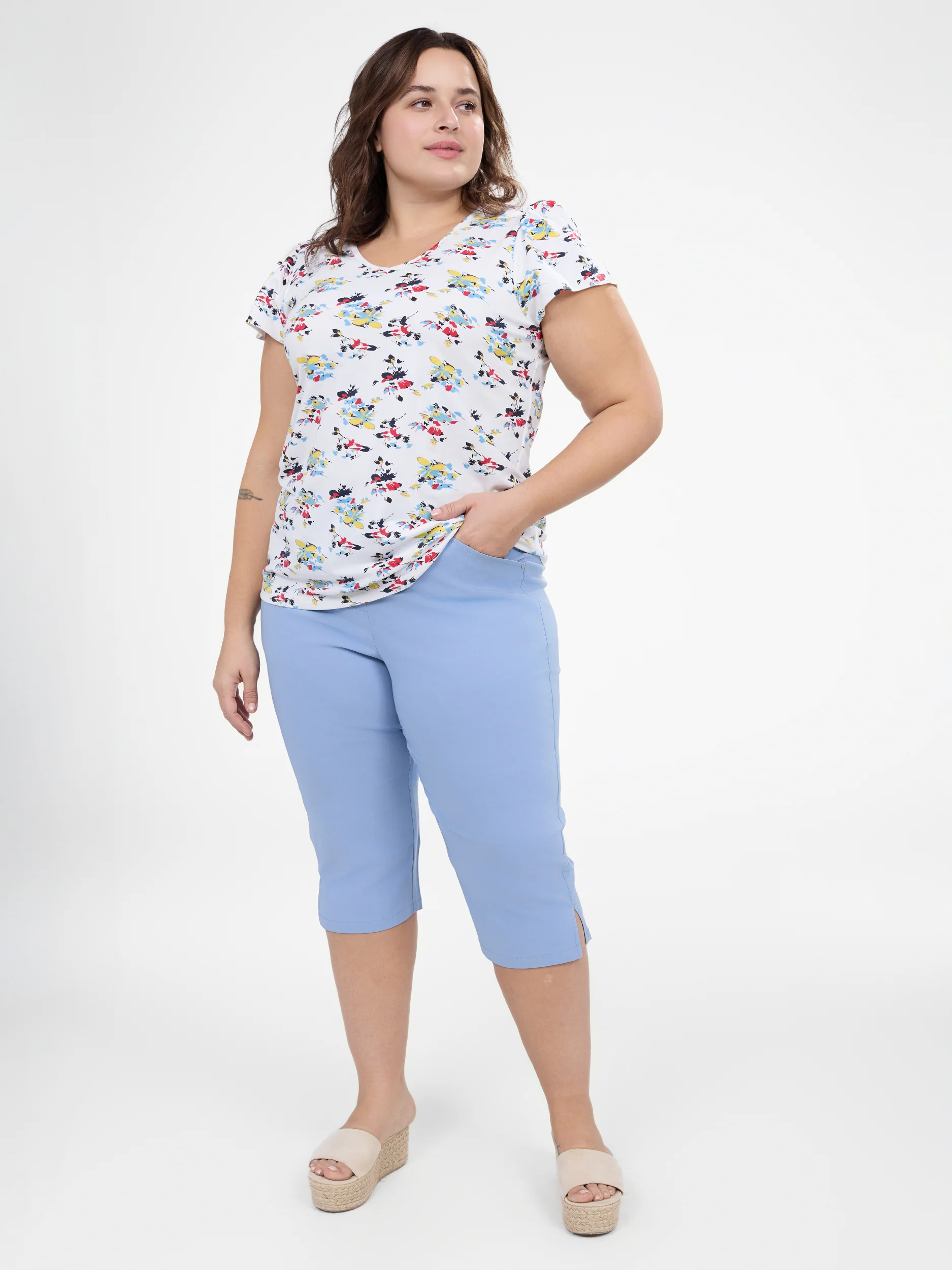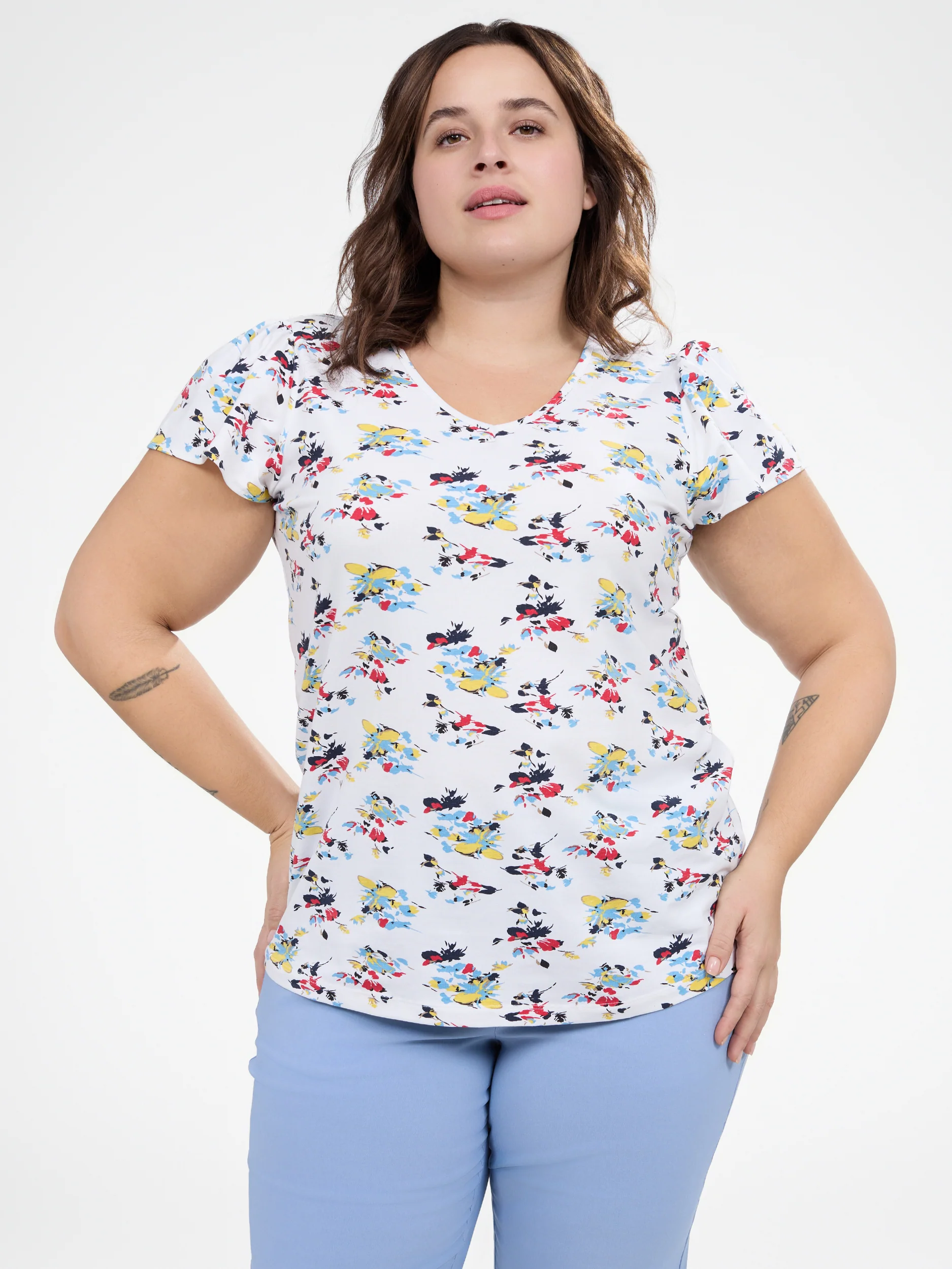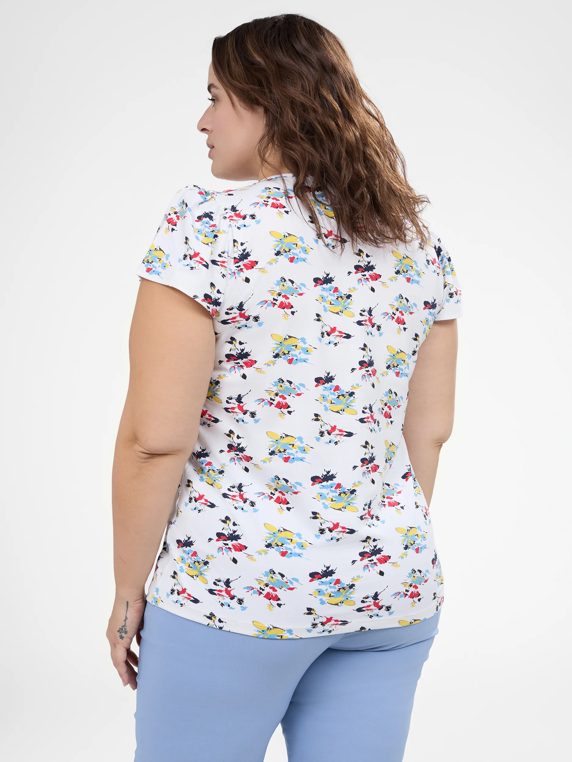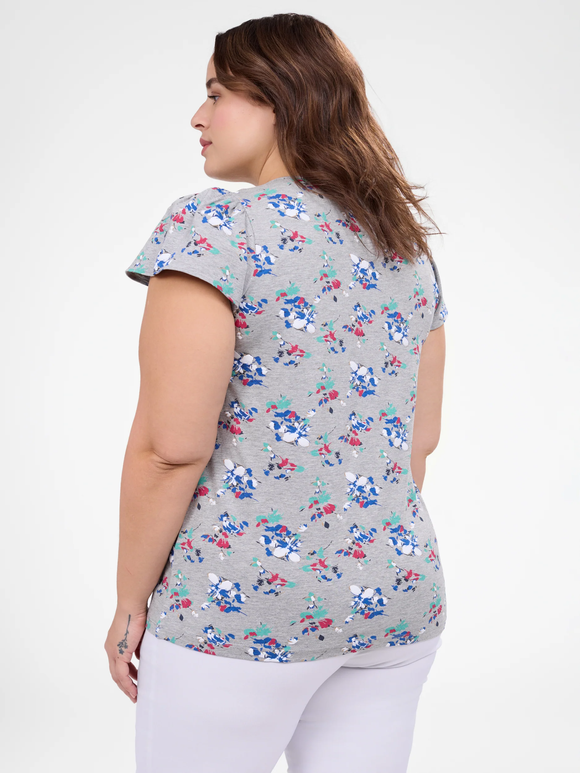 Ce t-shirt taille plus est idéal pour un look féminin et décontracté grâce à son imprimé fleuri et son tissu doux. Son ourlet arrondi et sa coupe fluide offrent une liberté de mouvement optimale tout au long de la journée.