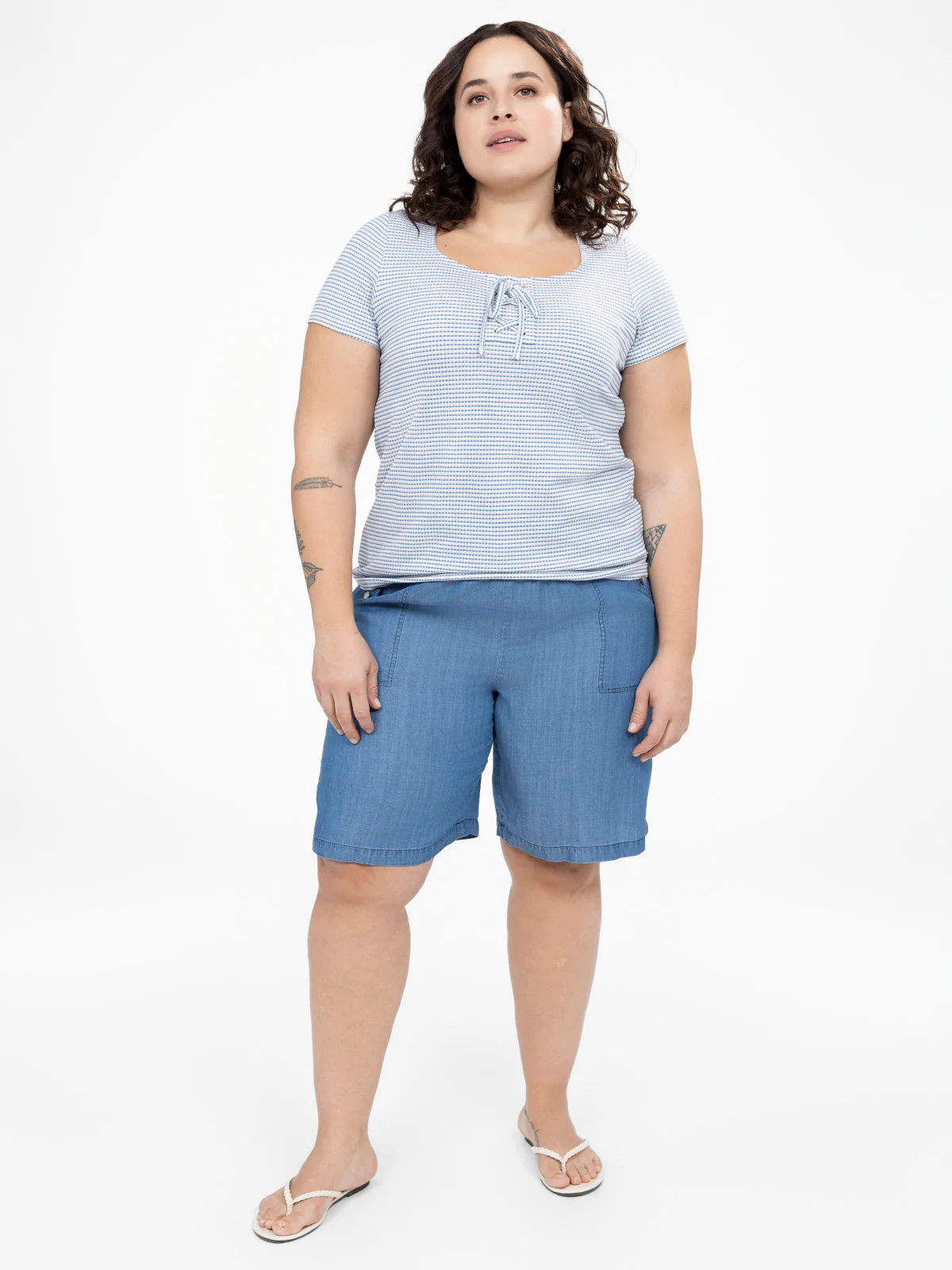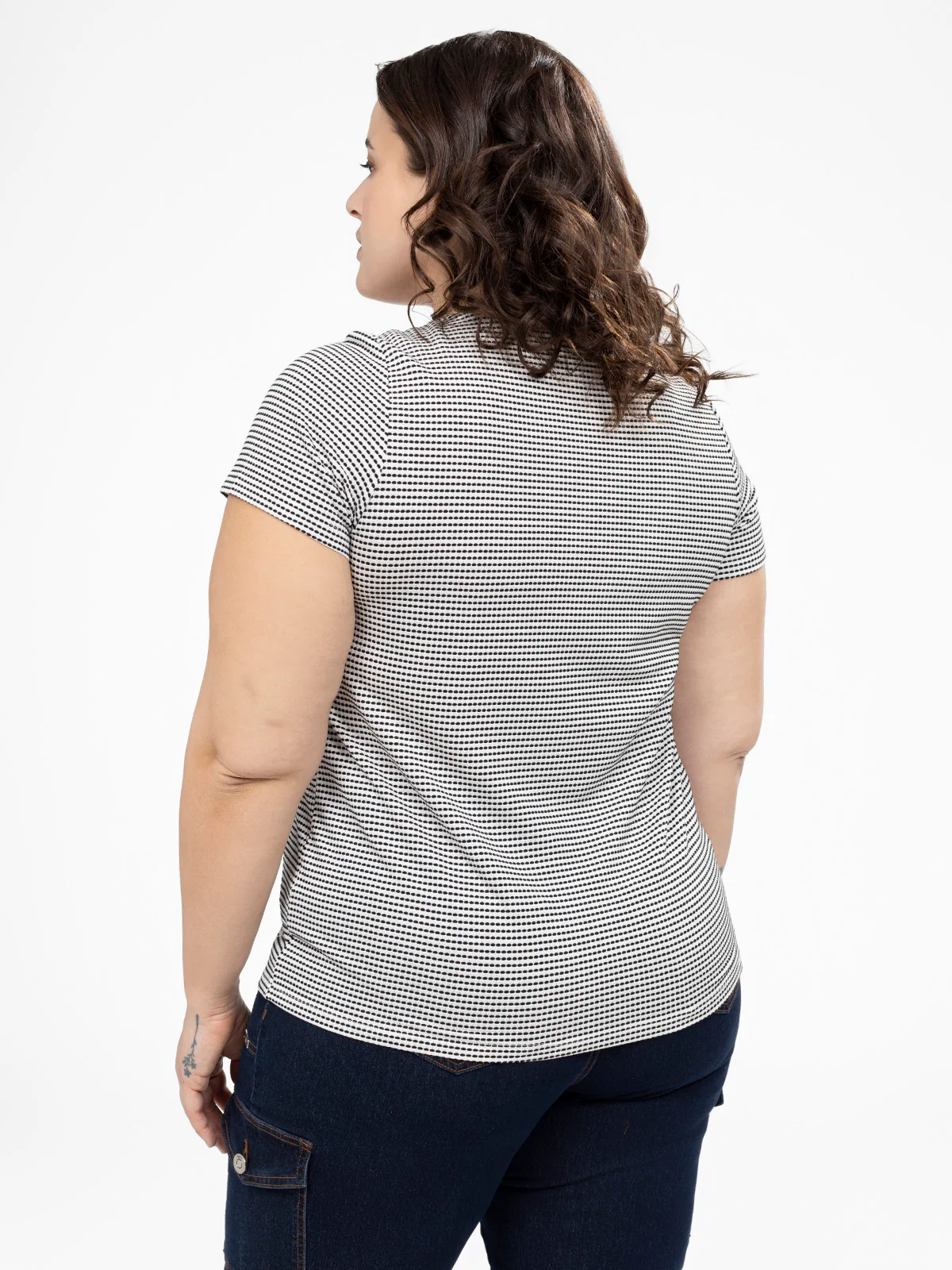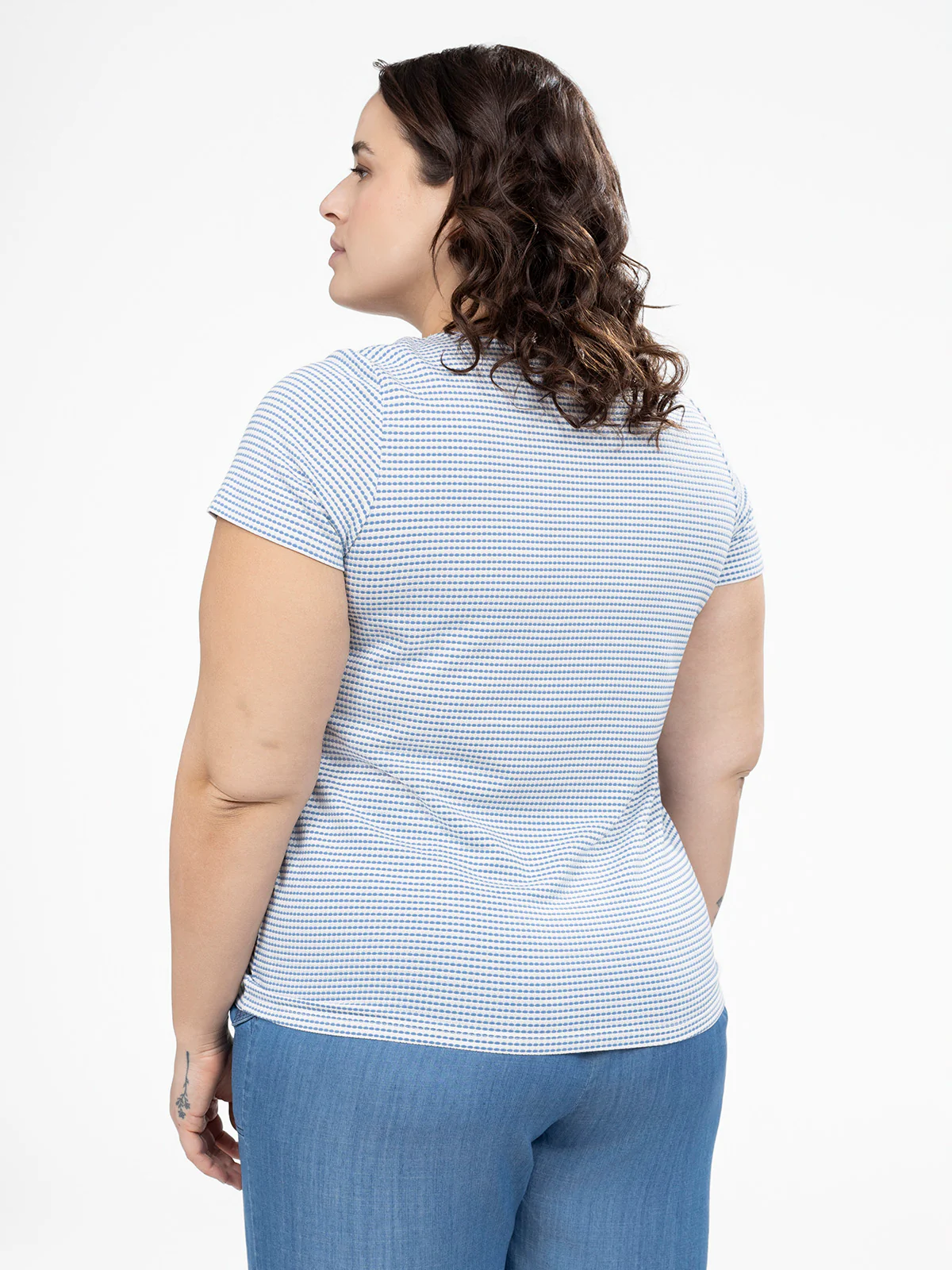 Doté d’un col arrondi agrémenté d’un laçage, ce t-shirt taille plus en maille douce combine style et confort. Sa coupe semi-ajustée, ses manches courtes et son imprimé structuré créent une silhouette flatteuse qui se porte en toute occasion.