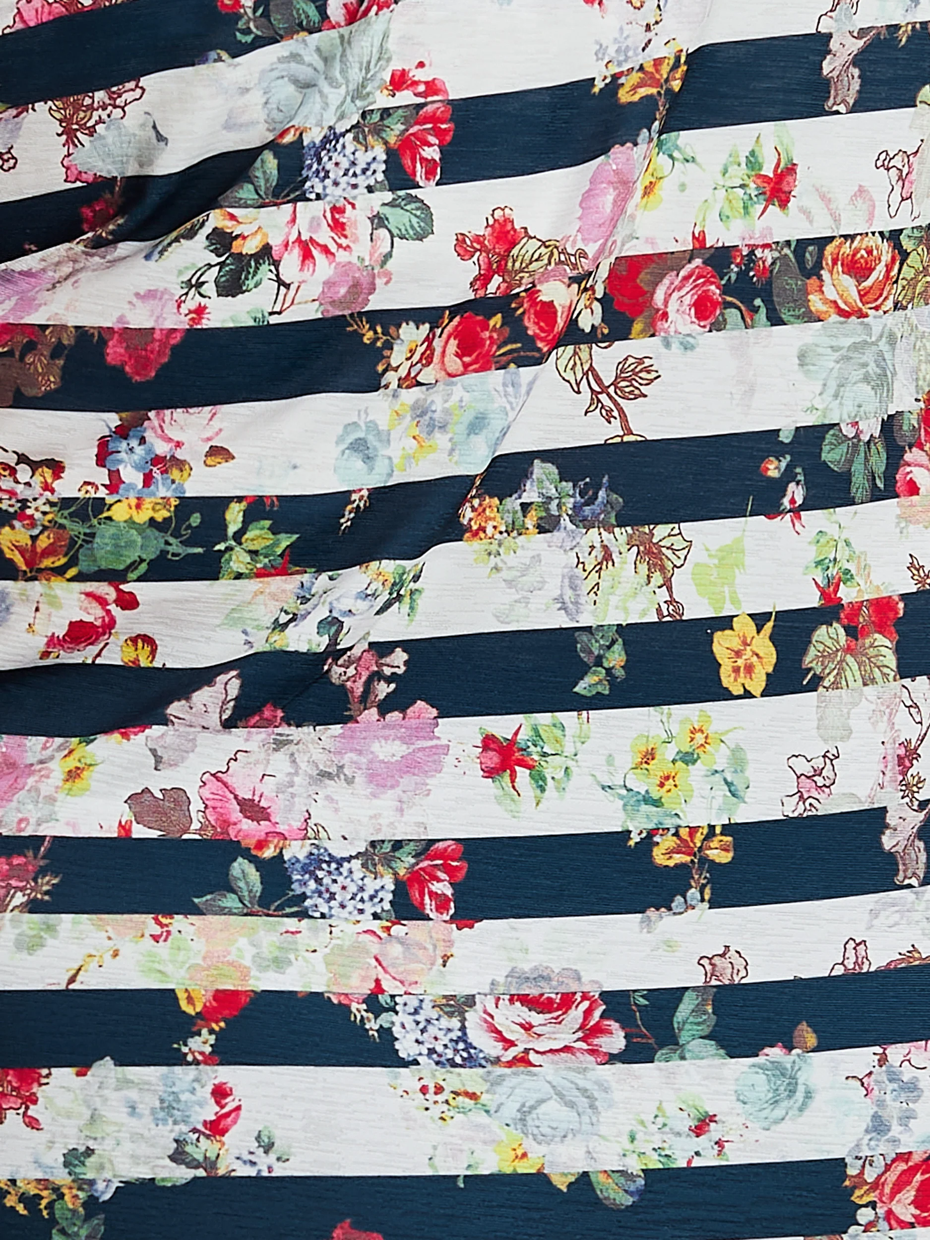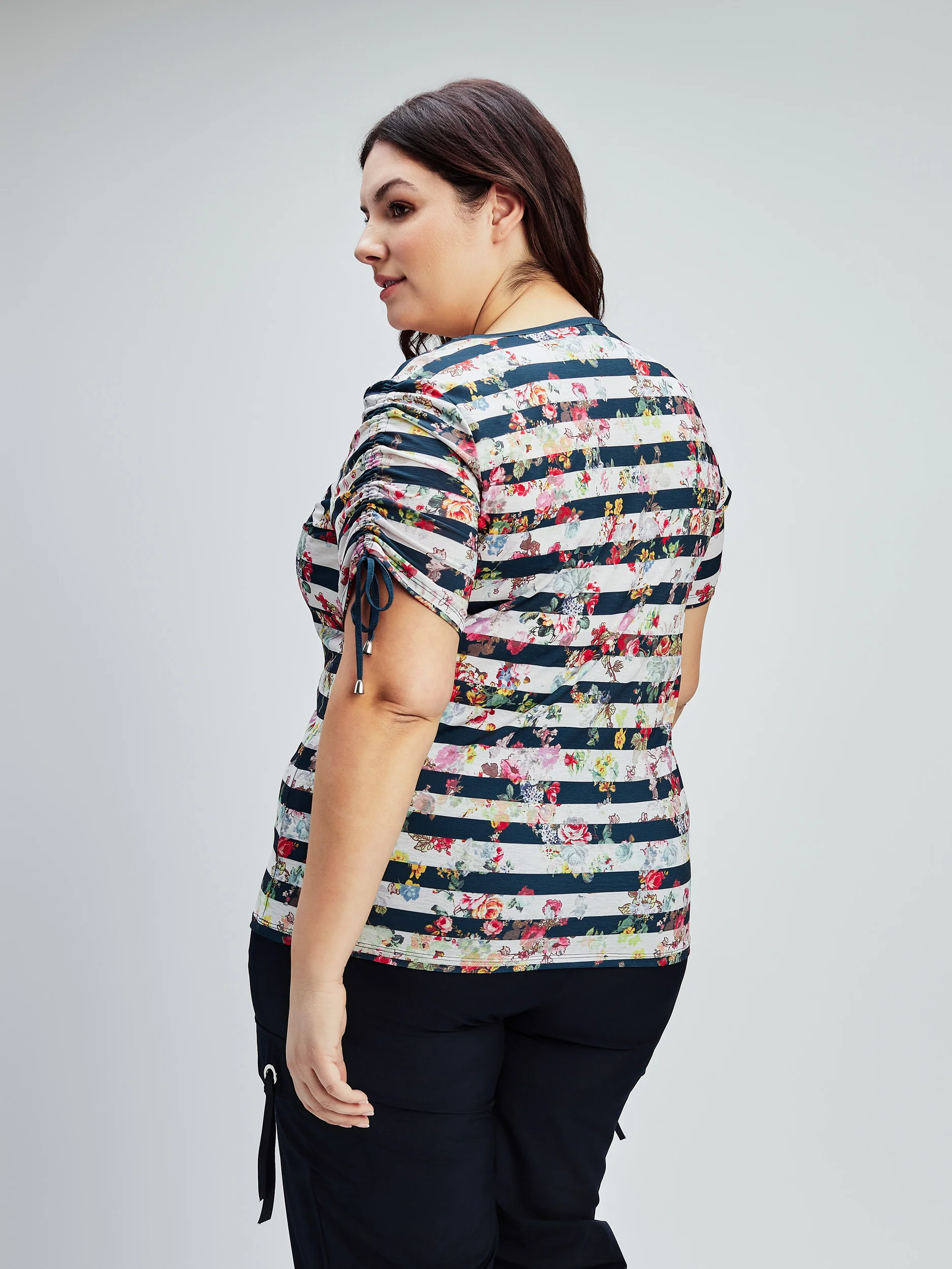Ce tee-shirt semi-ajusté à manches courtes, avec ses rayures et ses délicats accents floraux apportant une touche de fantaisie.