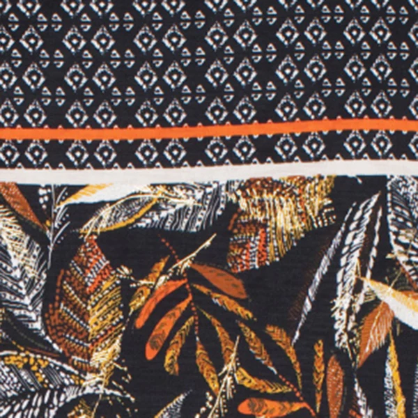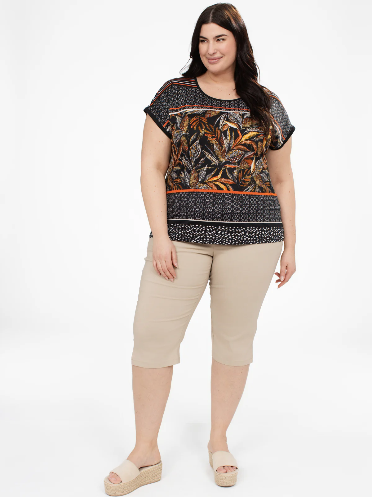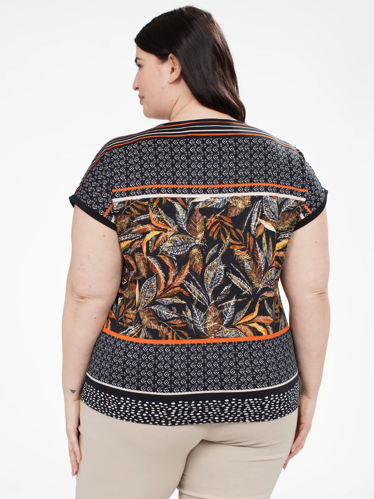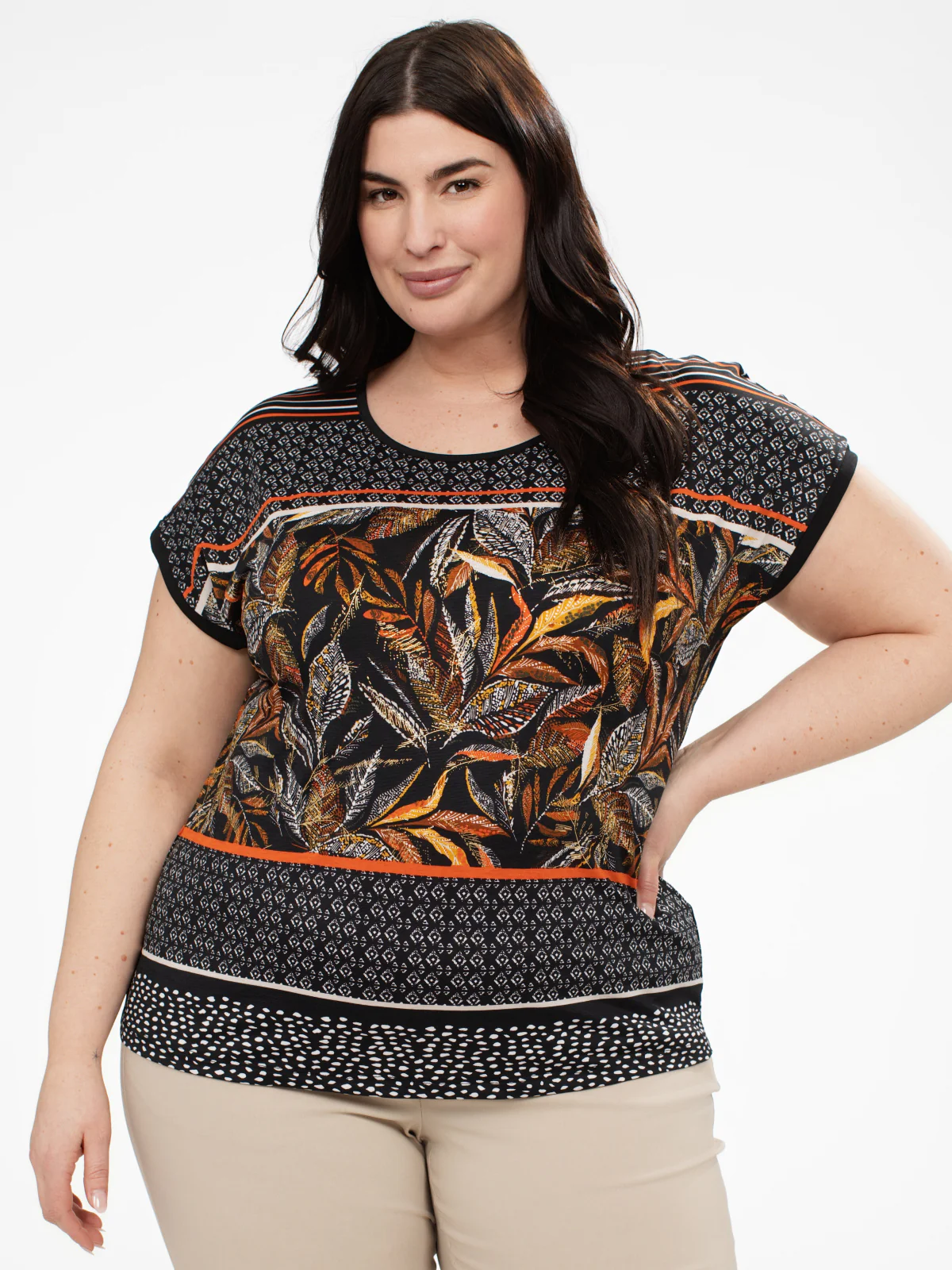Ce t-shirt taille plus est confectionné dans une maille souple imprimée de feuillages orangés et de micro-motifs géométriques en contrastes placés. La manche courte forme un revers intégré, soulignant l’épaule sans serrer.