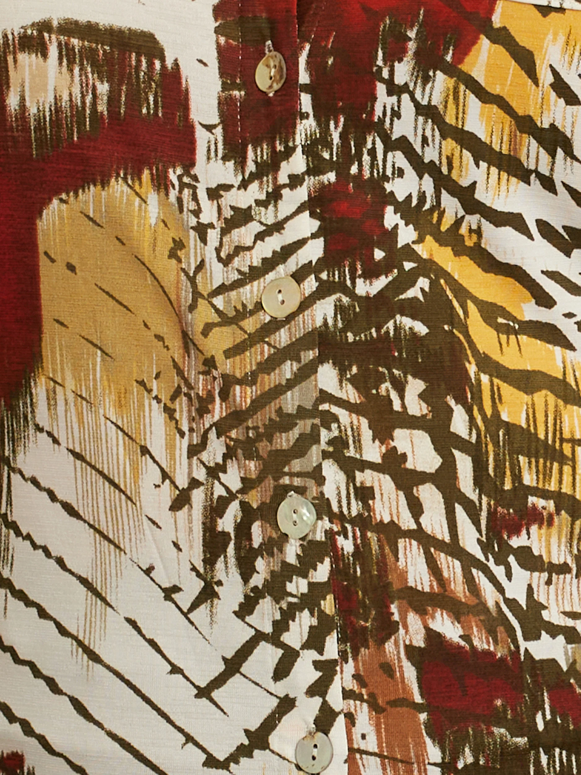 Cette tunique imprimée semi-ajustée présente une silhouette décontractée avec des manches de 3⁄4, et comporte deux poches plaquées.