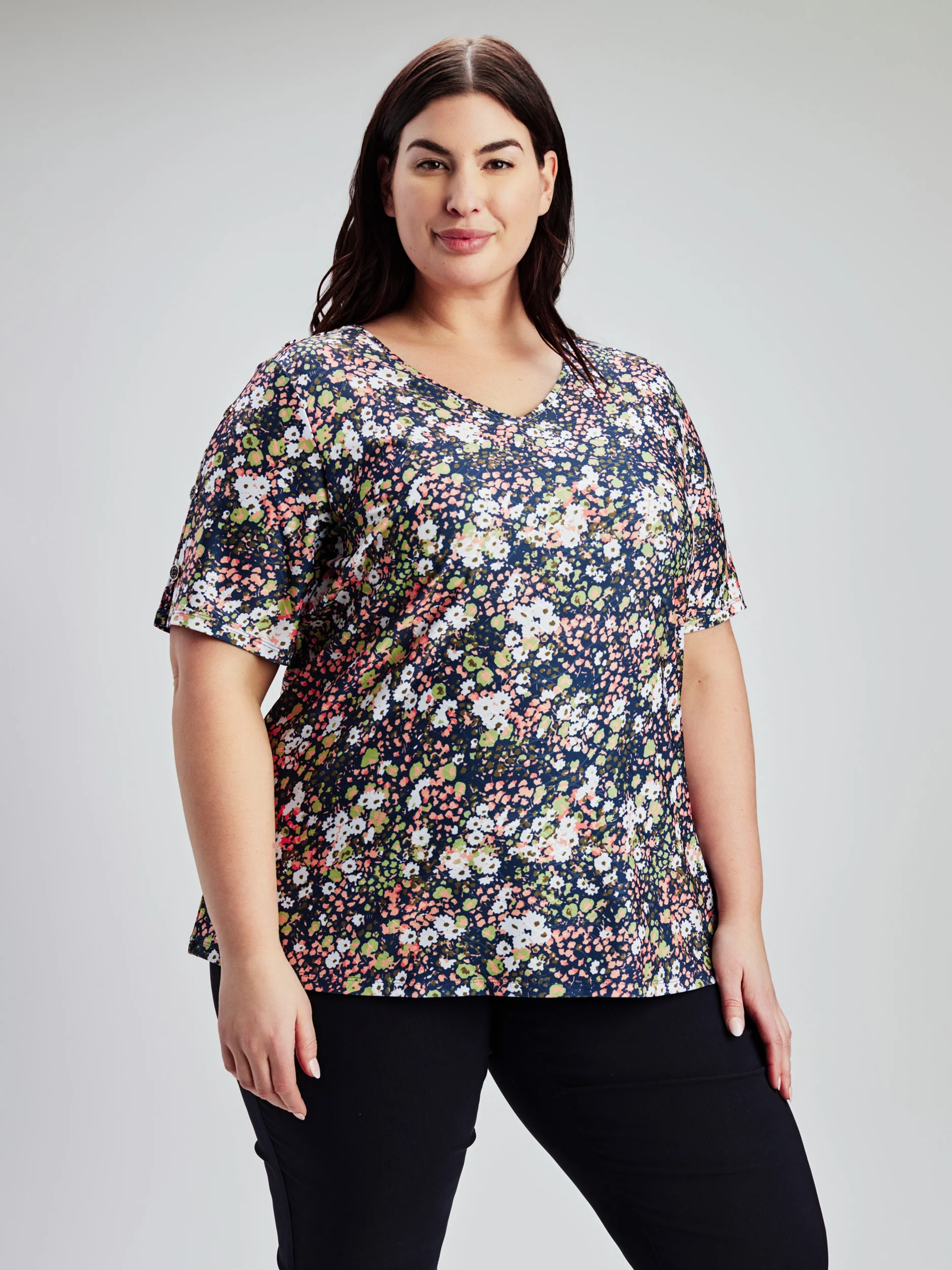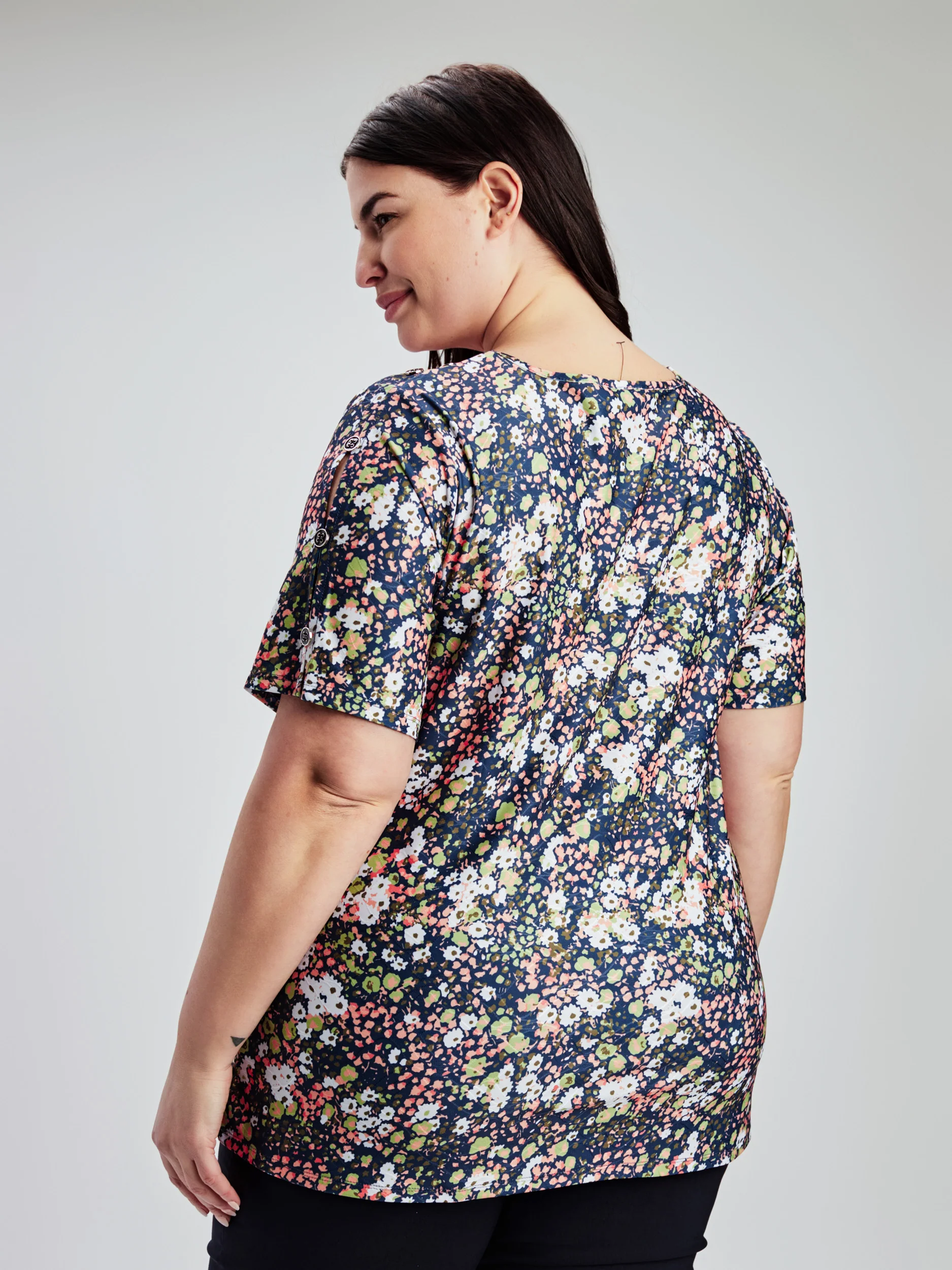 Cette tunique semi-ajustée présente une silhouette décontractée et de petits motifs floraux, parfaits pour le brunch ou le shopping.
